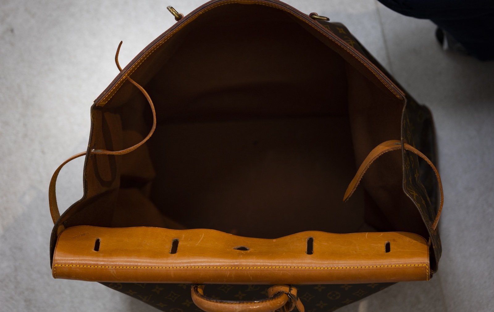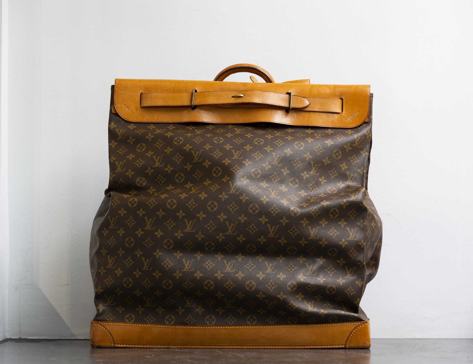 VUITTON LOUIS Borsone Monogram. Tela. Cm 55,00 x 60,00 x 23,00. Borsone weekend Louis Vuitton vintage, in tessuto monogram e dettagli in vacchetta. Lievi segni del tempo, patina.
