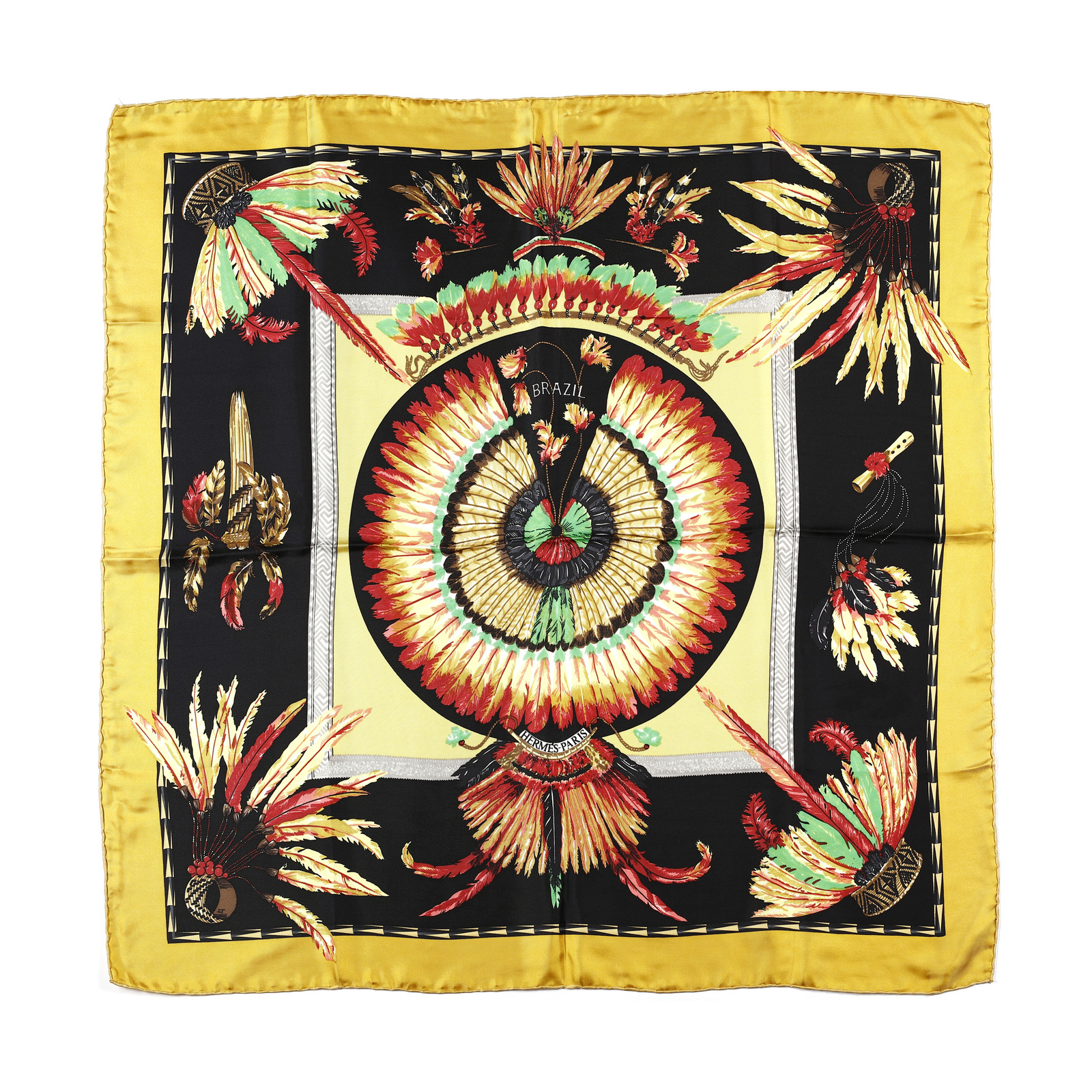 HERMES Foulard "Brazil" con bordo senape. . Seta. Cm 88,00 x 88,00. Modello realizzato nel 1988 da Laurence Bourthoumieux.