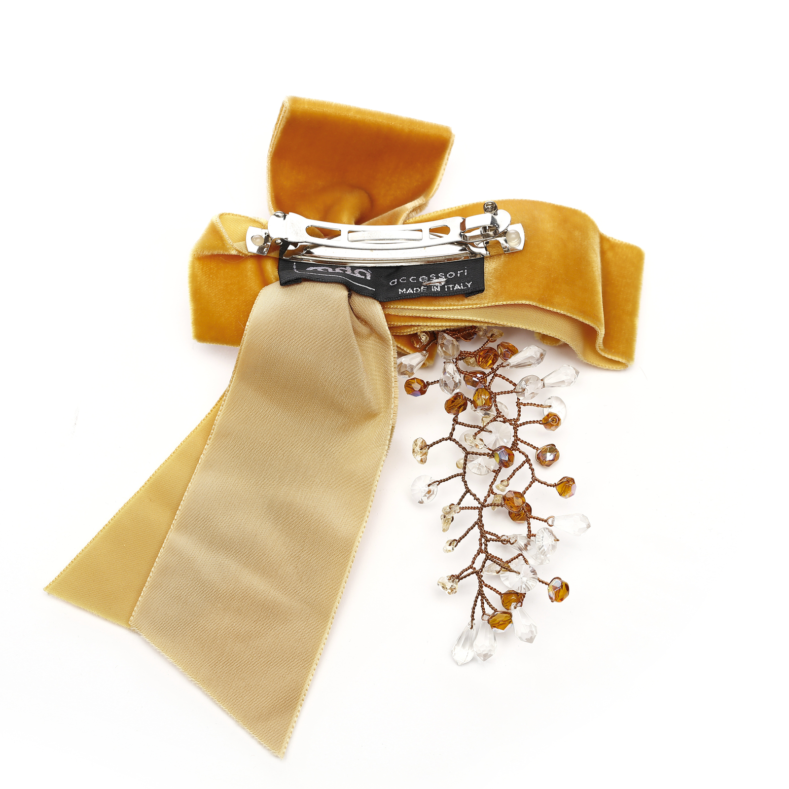 RADA' Fermacapelli fiocco velluto ocra e perline. Acciaio e tessuto. Cm 14,00 x 18,00. Etichetta presente al retro.