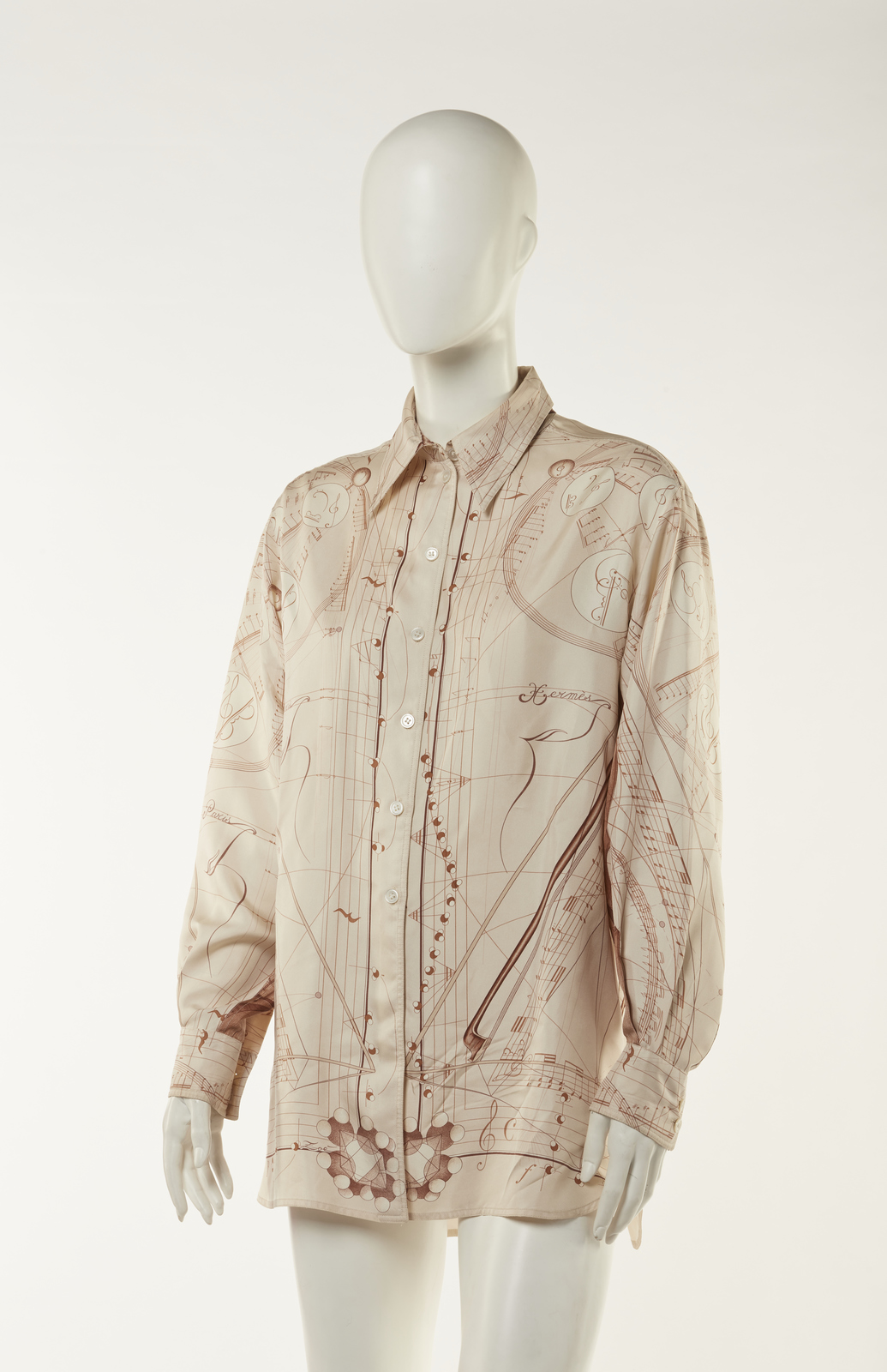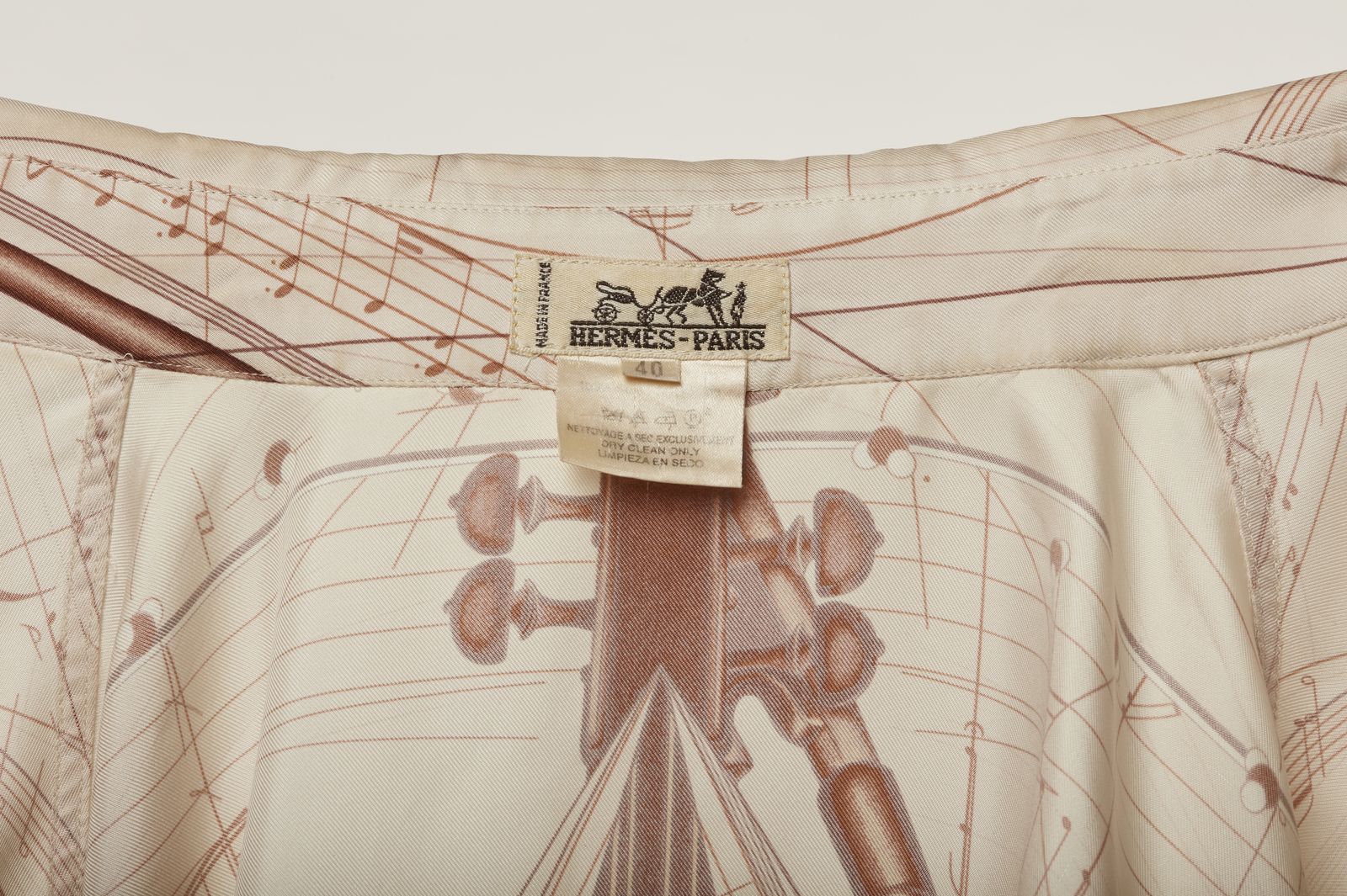 HERMES Camicia in seta stampata. . Seta. . Splendida camicia Hermès vintage stampata a motivi "La Musique des Sphères", disegnata da Zoe Pavwels, collezione P/E 1996, taglia 44 IT.