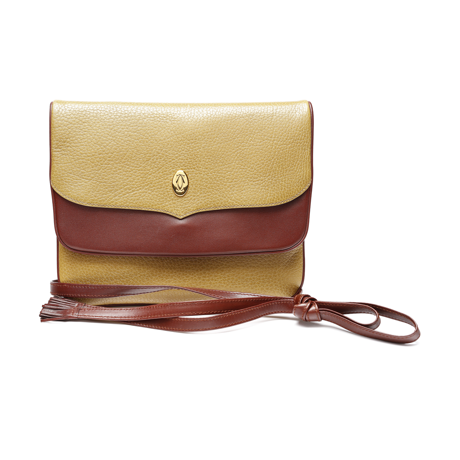 CARTIER Borsa tracolla bicolore. Pelle. Cm 19,00 x 22,00. Borsa a tracolla Les Must de Cartier in pelle bicolore color bordeaux e senape. Certificato di autenticità presente.