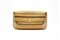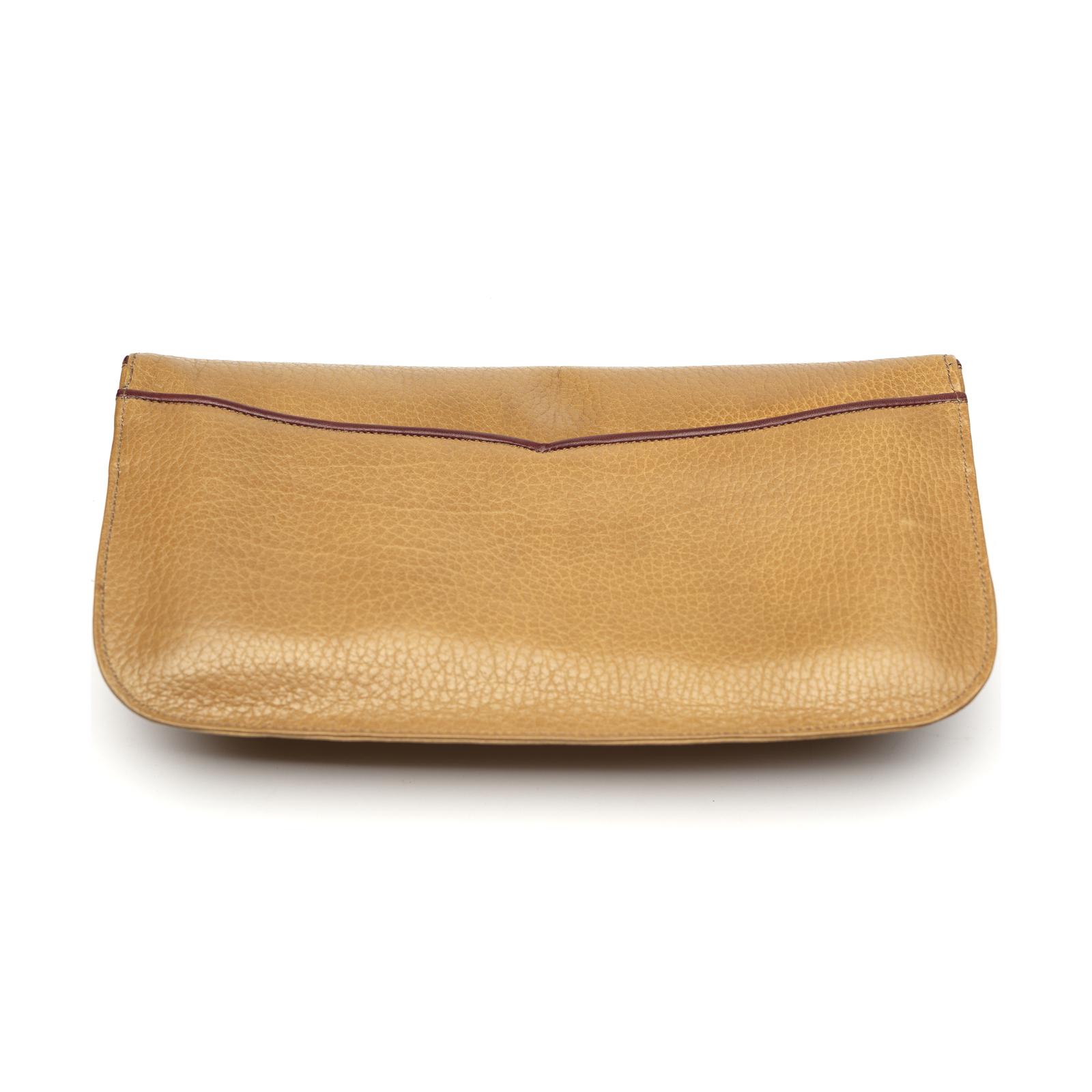 CARTIER Borsa Les Must de Cartier. 1990. Pelle. Cm 16,00 x 27,50 x 5,50. Borsa modello pochette in pelle martellata color senape con profili in pelle liscia bordeaux. Interno in tessuto logo bordeaux, logo interno, una tasca interna con chiusura a zip, anellino interno per le chiavi. Certificato e codice di garanzia. Chiusura con banda esterna ed elemento logo in galvanica dorata. Tasca semplice al retro.