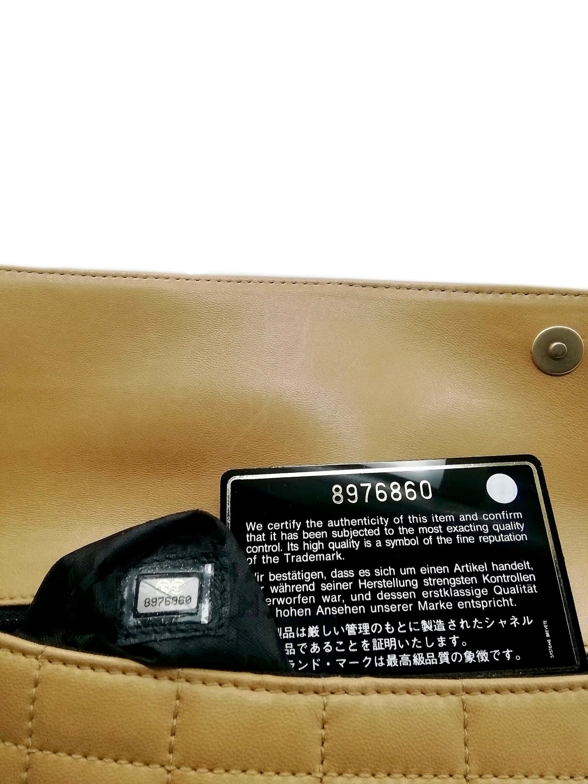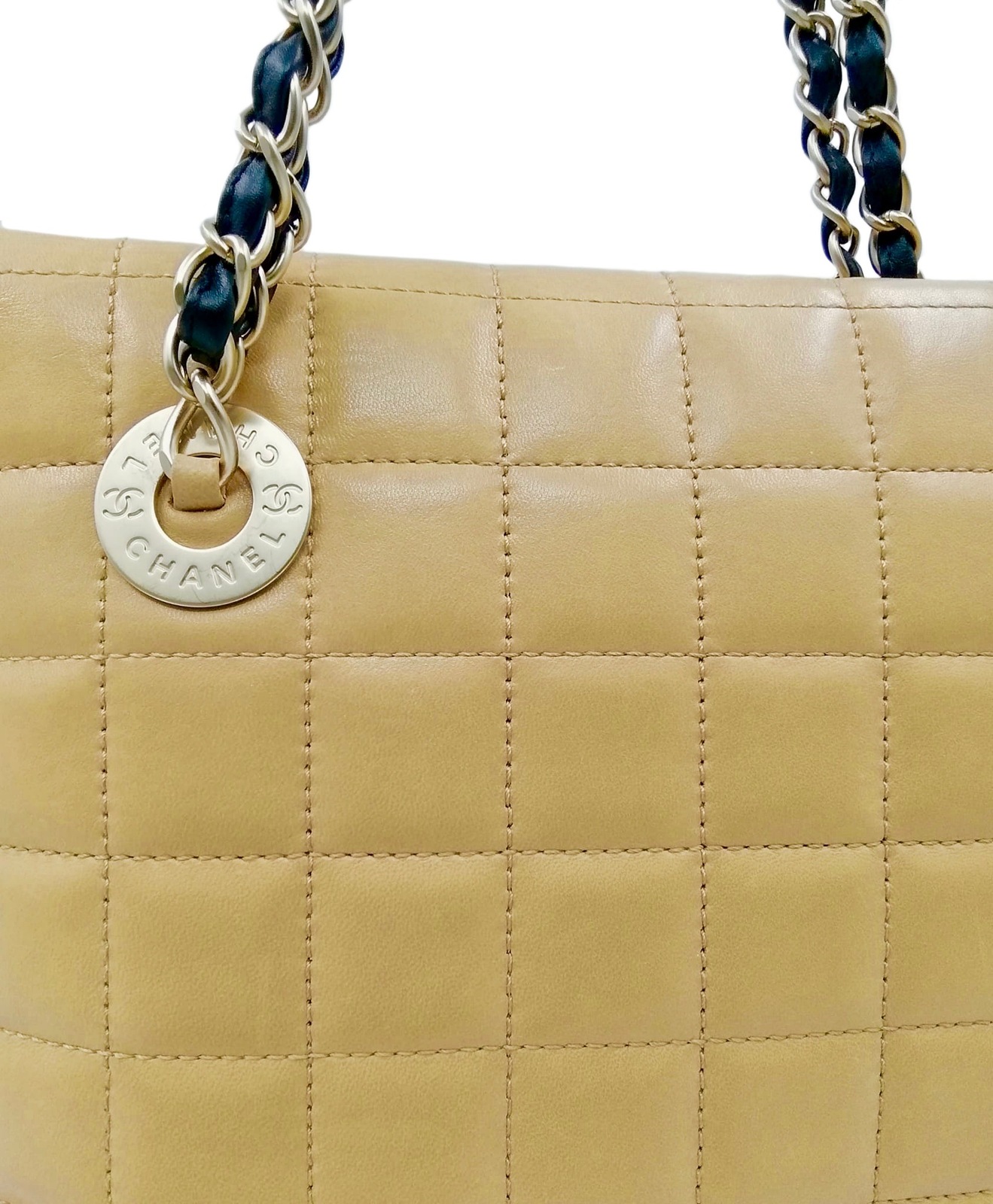 CHANEL Borsa Chocolate Bar. 2003. Pelle. Cm 26,00 x 22,00 x 3,00. Pelle di agnello beige, catene nere. Ottime condizioni. Chiusura con bottone a pressione, codice all'interno e carta di autenticità 8976860.