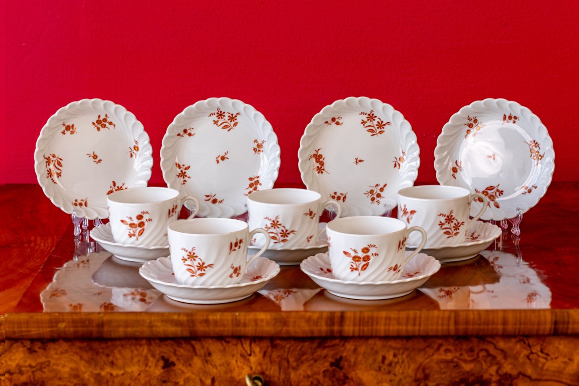 modello Ancona, decorate a motivi floreali nei toni del giallo e del rosso, decorate a decalcomania, corredate di piatti