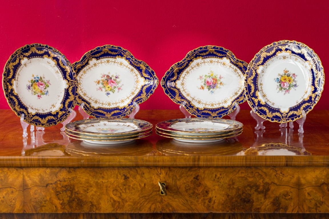 composto da 2 vassoietti ed 8 piatti, realizzati con tesa sagomata nei toni del blu e decoro a motivi floreali e festoni in oro
