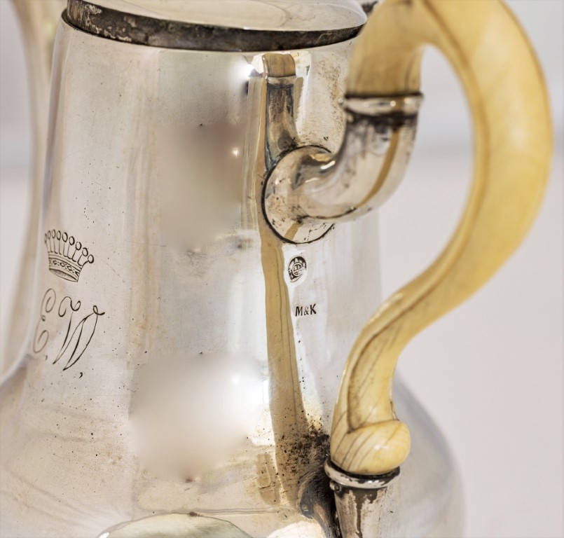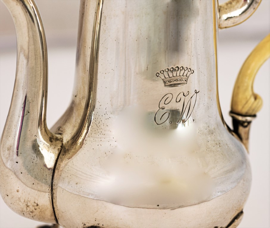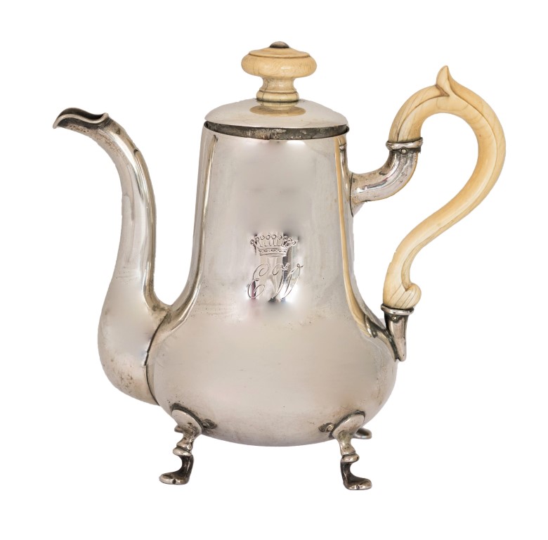facitore M&K, corpo liscio su quattro piedini stilizzati, manico e presa del coperchio in osso, monogramma E.W. coronato inciso sul collo