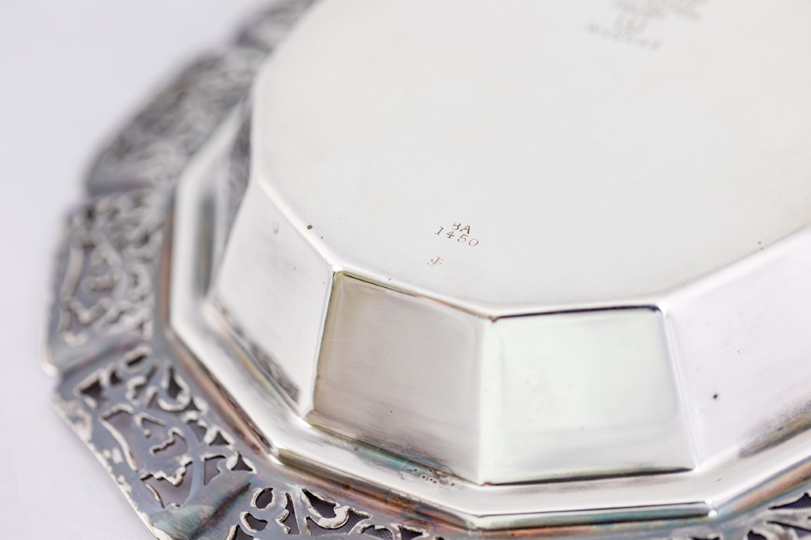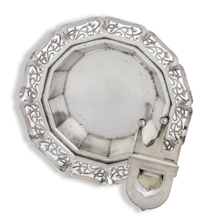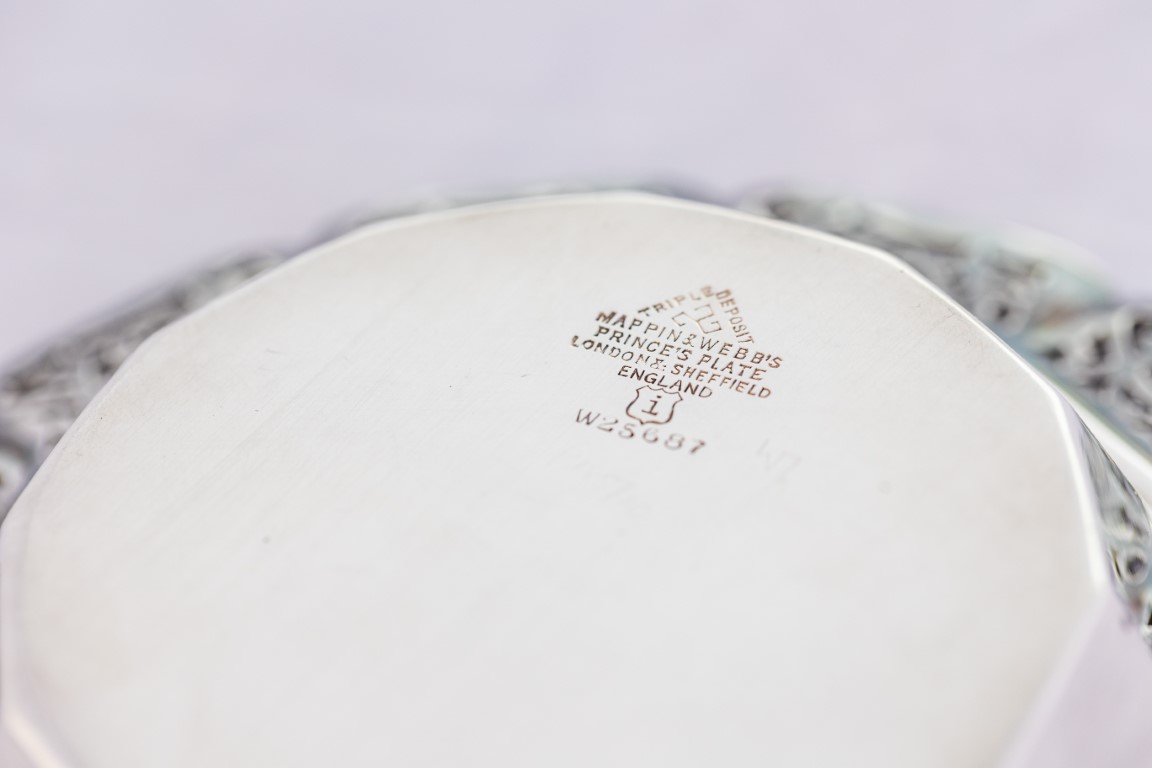 composto da 1 cestina in sheffield, Mappin & Webb, inizi sec. XX, con bordo traforato a motivi floreali, e altro oggetto