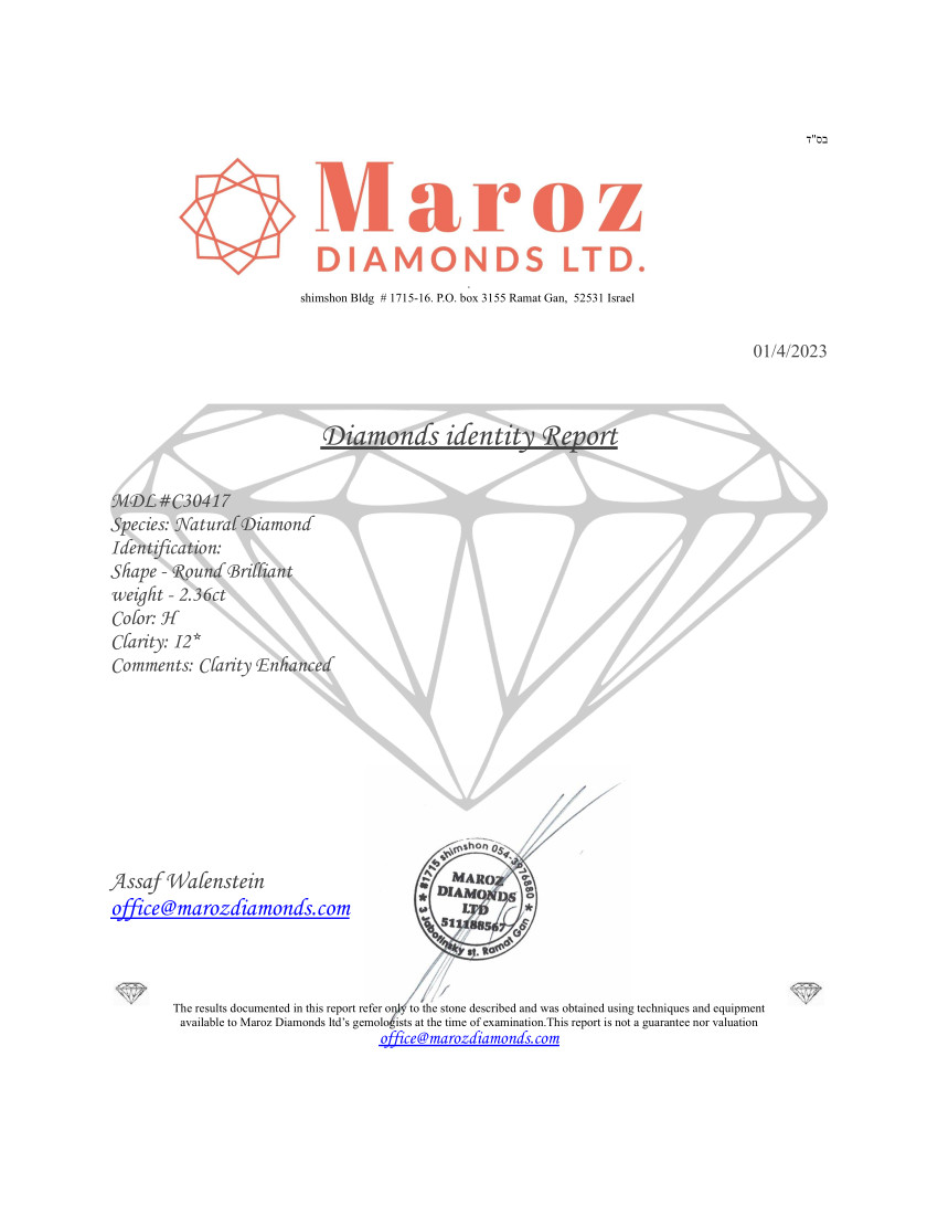 DIAMANTE PUREZZA ESALTATA 2,36 CT H - PUREZZA I2* - TAGLIO BRILLANTE - CERTIFICATO ID - C30417