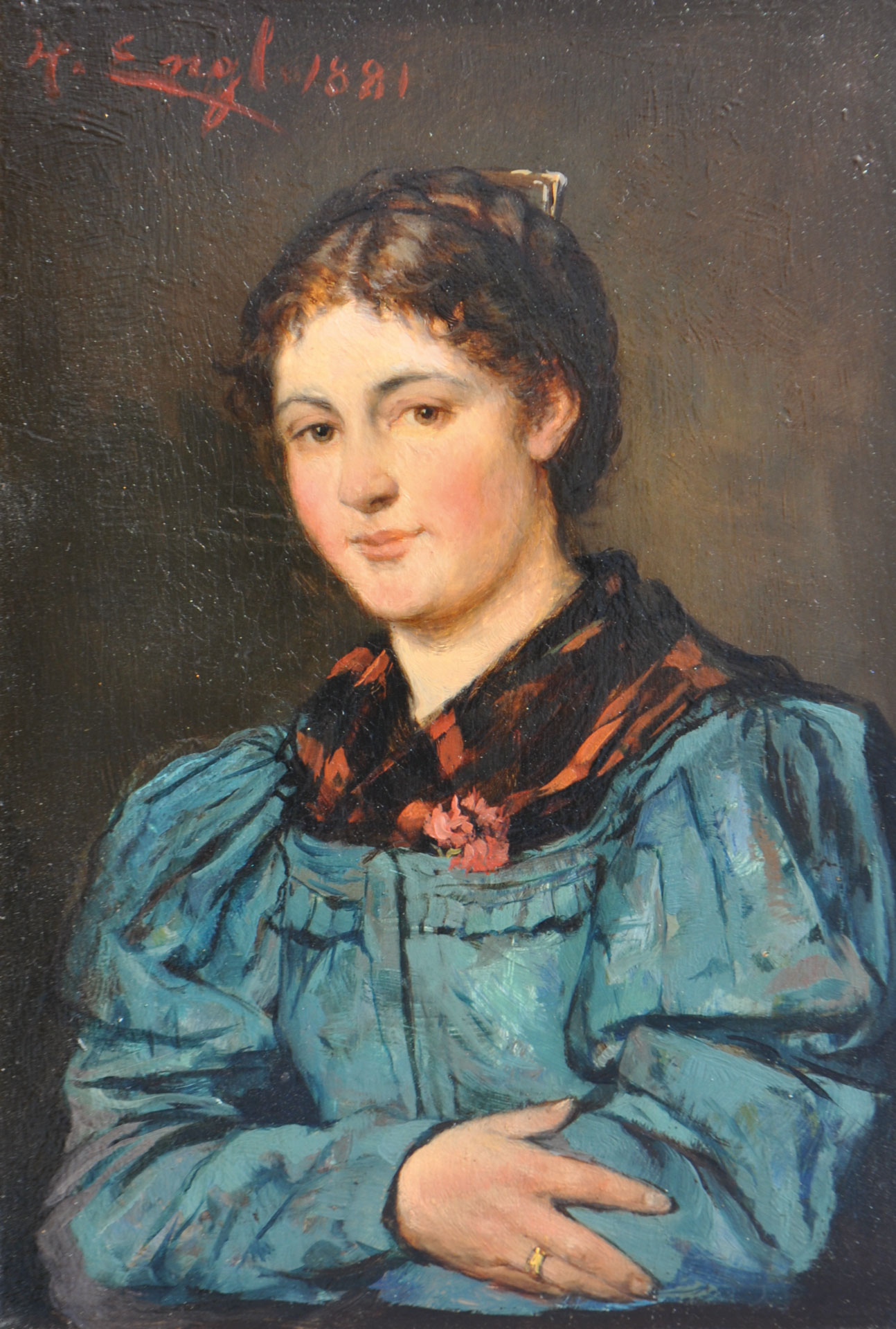 Hugo Engl (Lienz 1852 - Silz 1926) Contadinella tirolese, 1881;Olio su tavola, 22 x 15,3 cm, in cornice