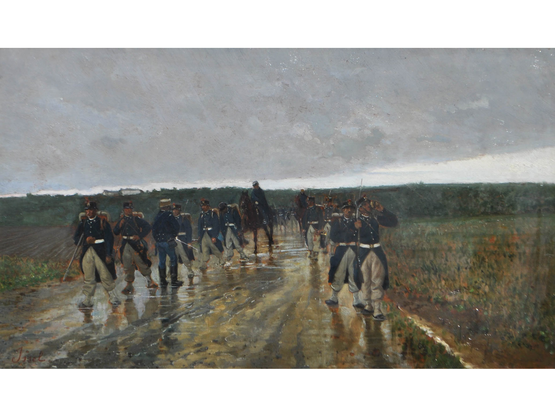 Alberto Issel (Genua/Genova 1848 - 1926) Sotto la pioggia, 1873 ca.;Olio su tavola, 29,5 x 50,5 cm, al retro dichiarazione di autenticità di Sandro