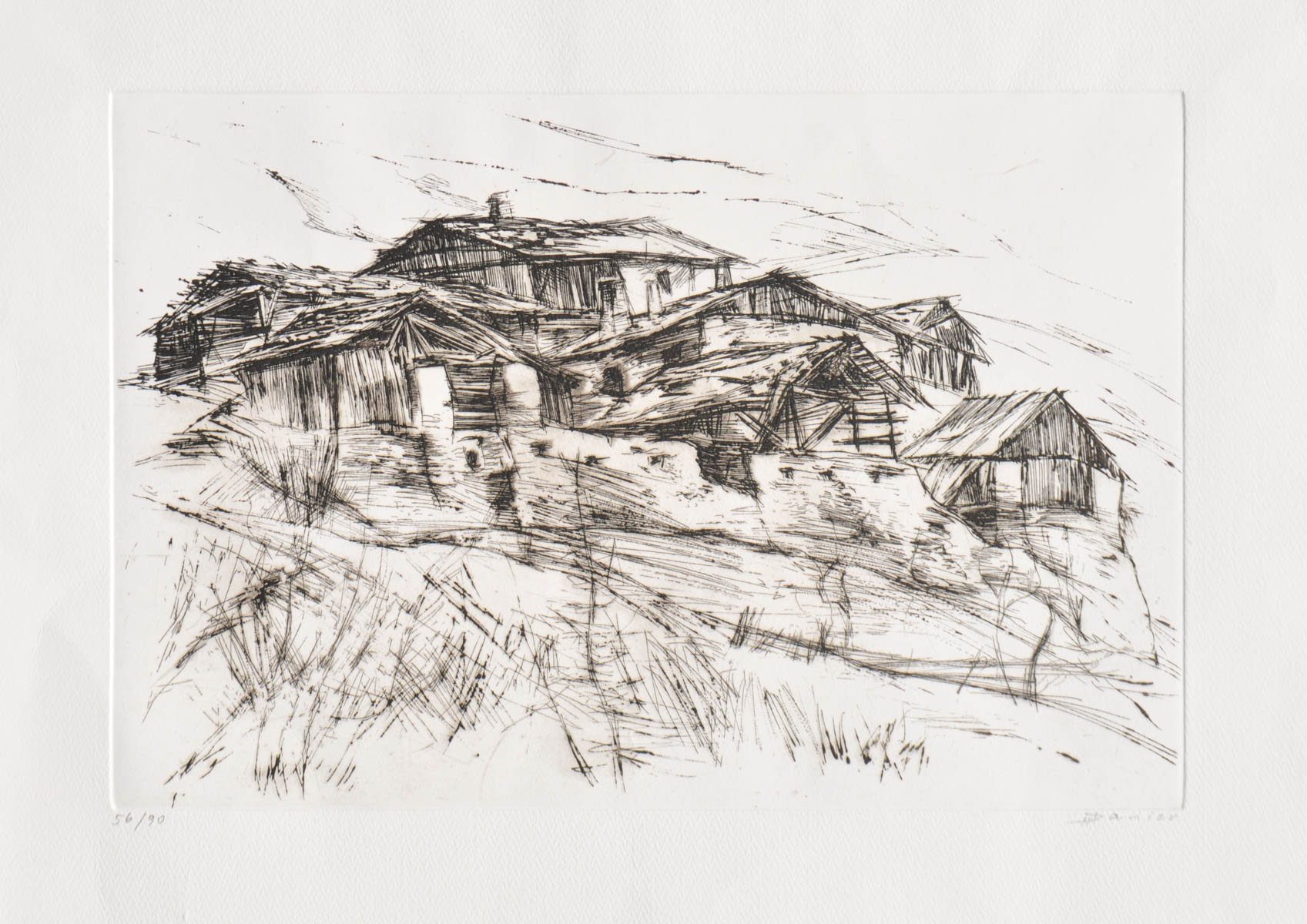 Herbert Danler (Fulpmes 1928 - Telfes im Stubaital 2011) Maso di montagna in Tirolo;Acquaforte, 19,5 x 29,5 cm (lastra)
