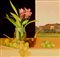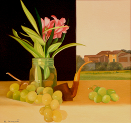 LORENZETTI Adolfo (Lucca, 1952) Composizione con paesaggio olio su tela cm. 25 x 25 Firma 'A. Lorenzetti' (in basso a sinistra) Titolo, tecnica, firma 'Composizione con paesaggio, olio su tela, Adolfo Lorenzetti' (al retro)