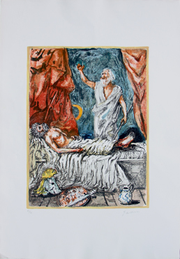 DE CHIRICO Giorgio (Volos 1888 - Roma 1978) Il sogno appare ad Agamennone, 1968 litografia a colori cm. 65 x 45.5 Edizione di 99 esemplari Firma 'G. de Chirico' (in basso a destra) Fotografia dell'artista con l'opera Bibliografia: G. De Chirico, S. Quasimodo, 'Iliade', Nardini Editore, 1982, p.17