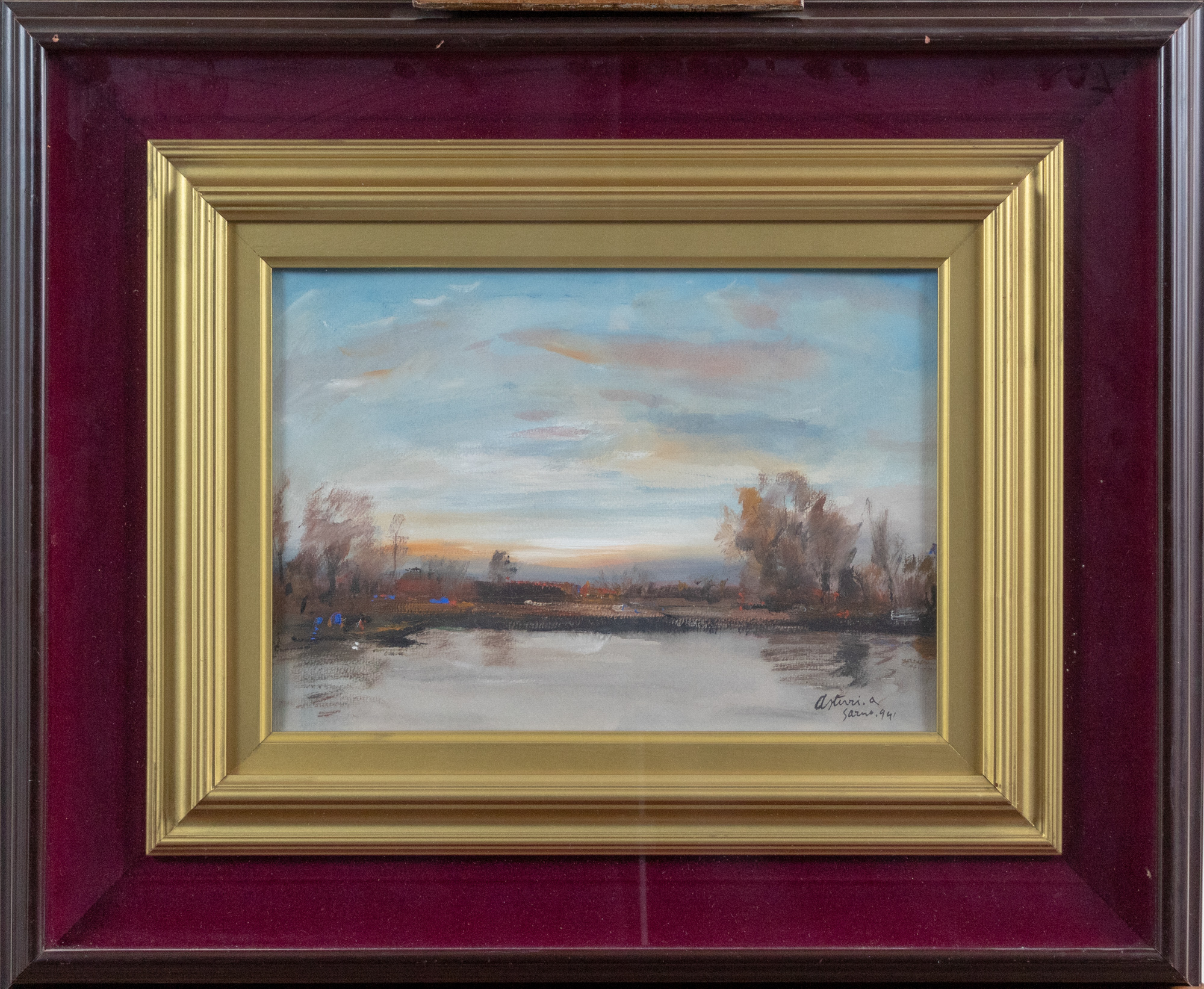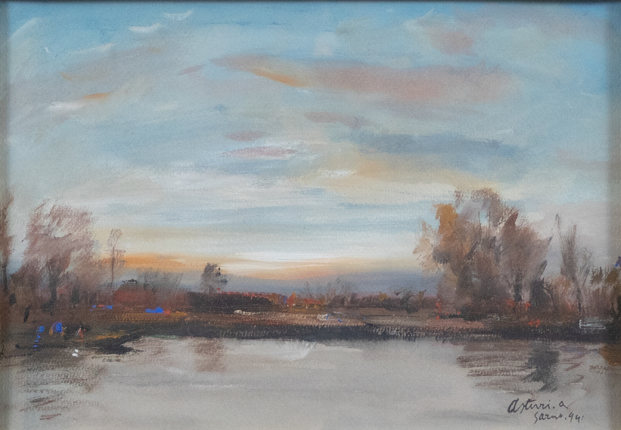 Antonio Asturi (Vico Equense, NA 1904 - 1986) Paesaggio all’alba, tempera su cartoncino, 24×34 cm, firmato e datato in basso a destra '(19)44'