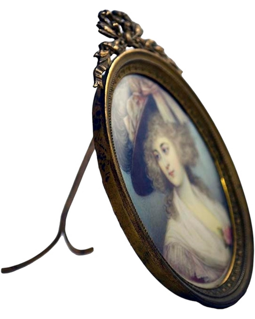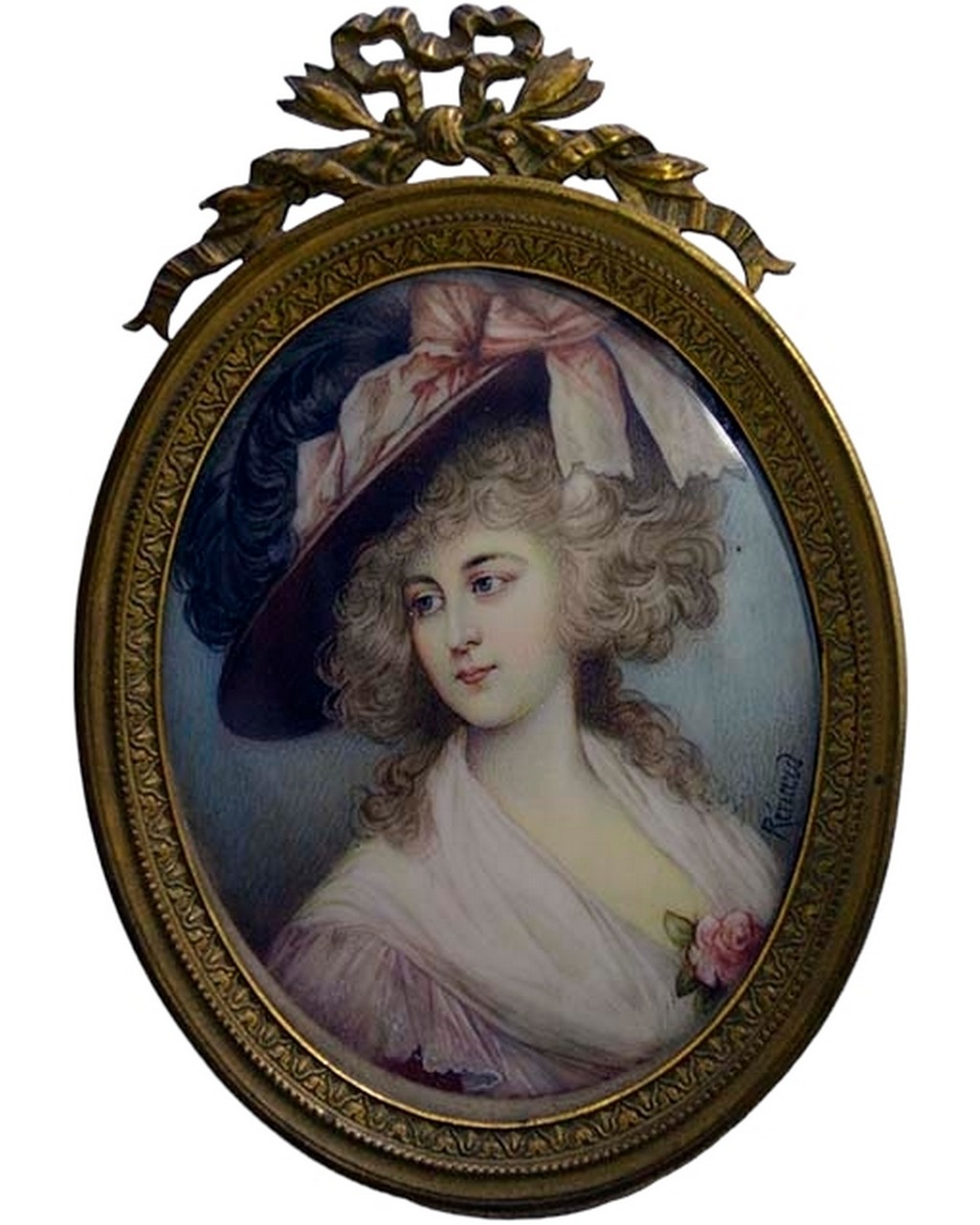 MINIATURA RAFFIGURANTE M.ME LA CONTESSA DI DU BARRY cornice in bronzo dorato decorata da nodo d'amore Luigi XVI XIX Francia h cm 11,8 x 8