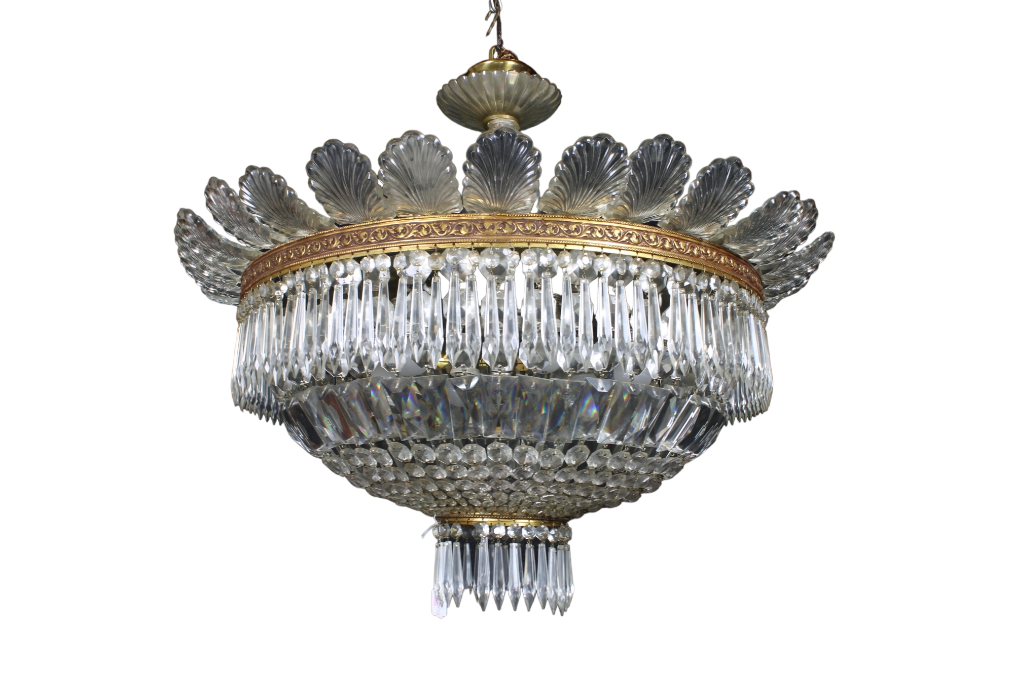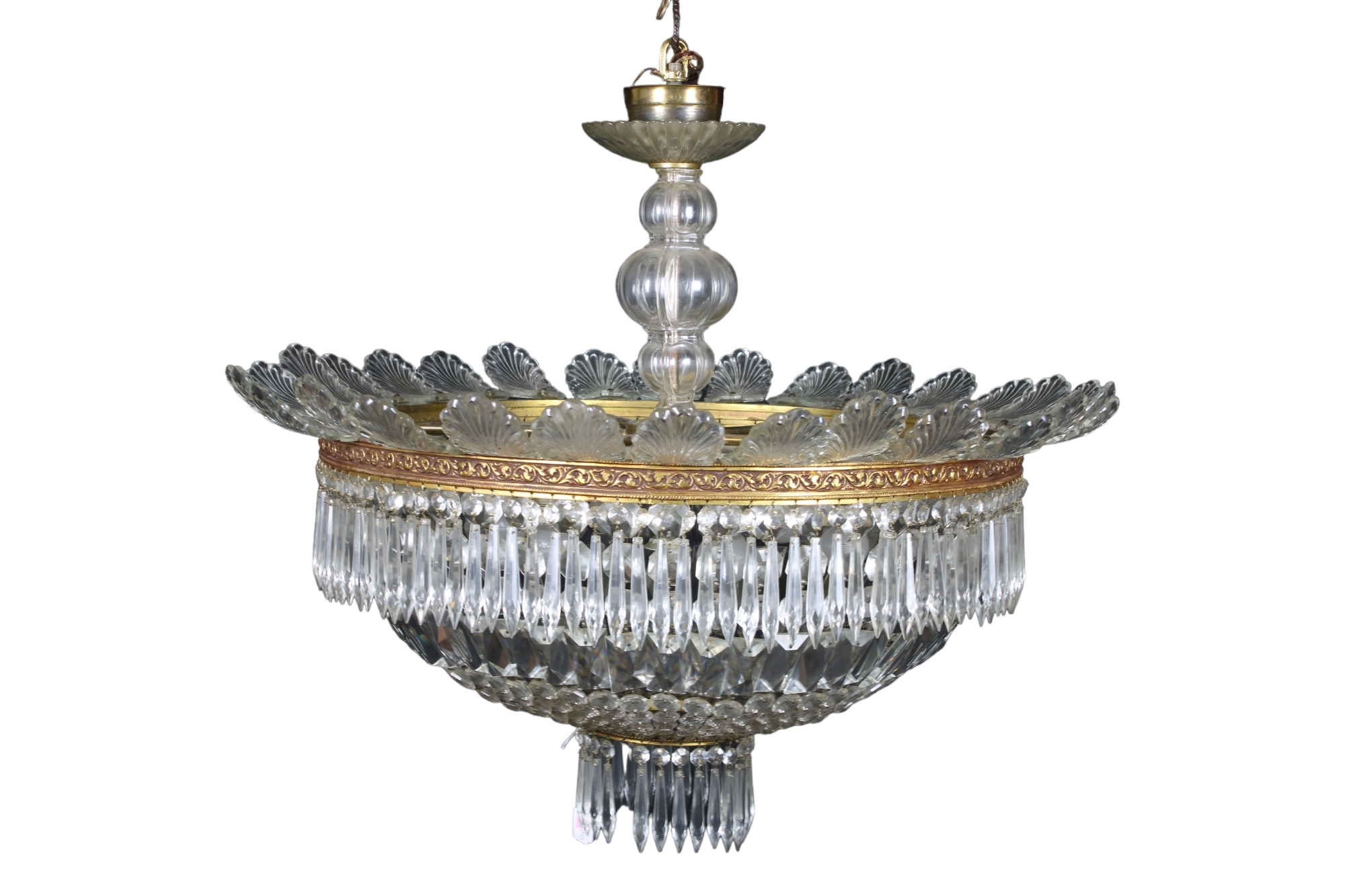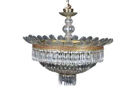 PLAFONIERA in fusione di bronzo cesellato e dorato, arricchita da foglie e pendenti in vetro manifattura sicilia 1880-1920 h cm 80 x Ø 77