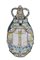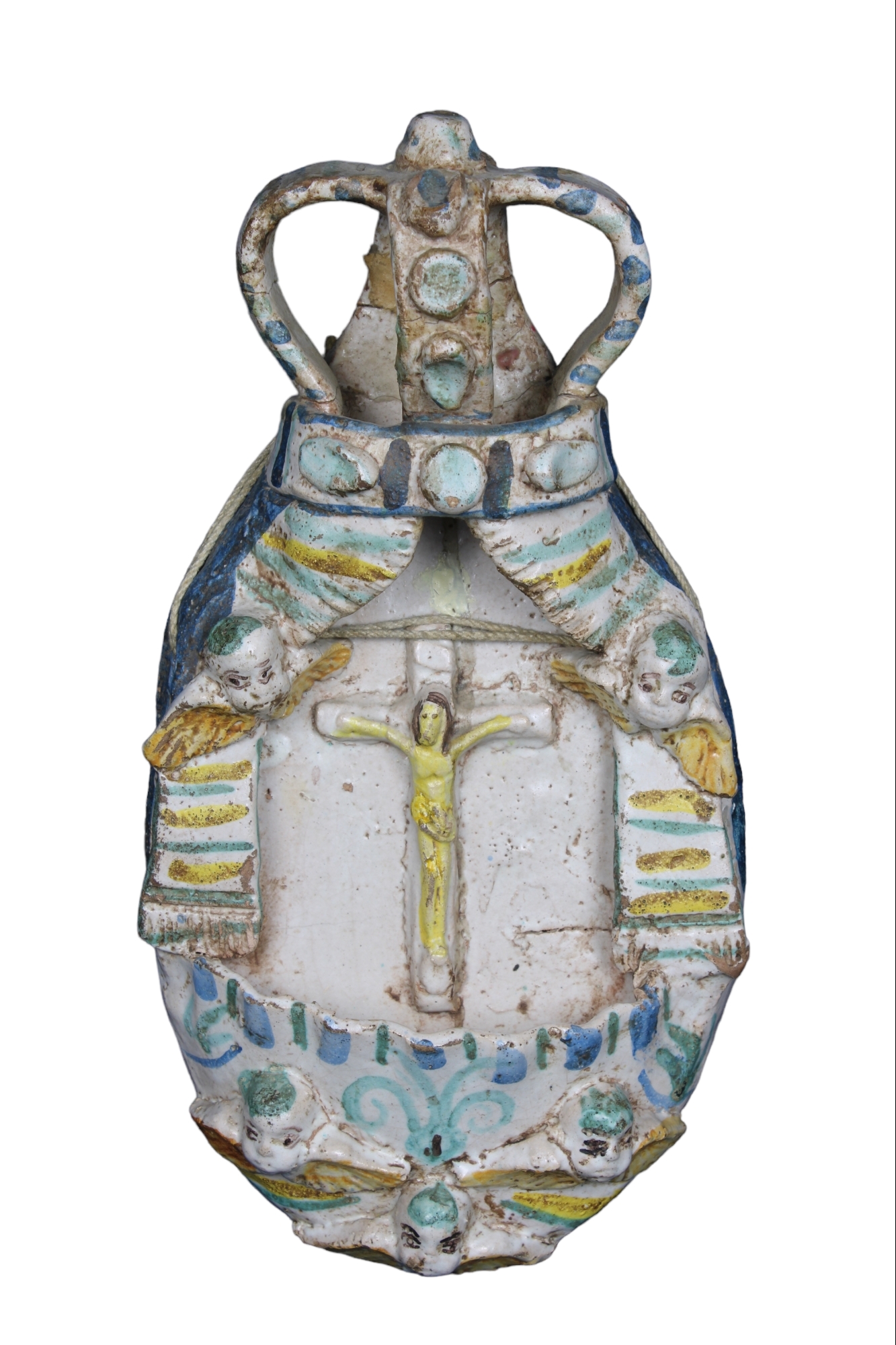 ACQUASANTIERA in maiolica policroma raffigurante Crocifisso e angeli vecchi incollaggi alla corona manifattura popolare sud Italia XIX secolo h cm 33 x 17 x 6