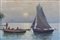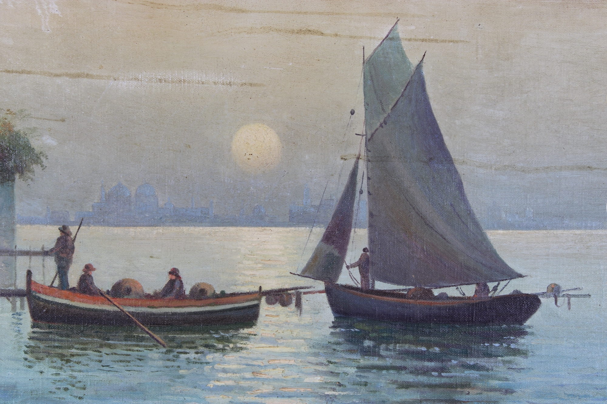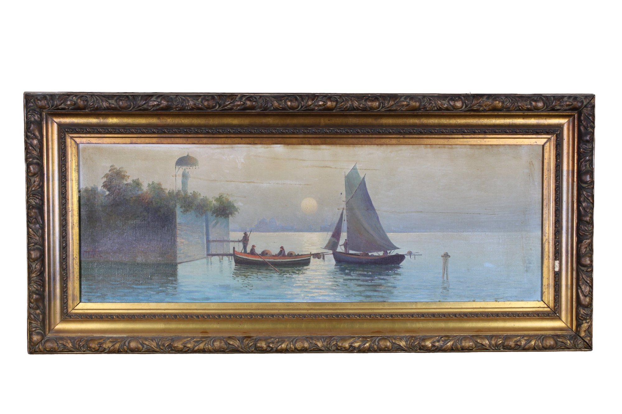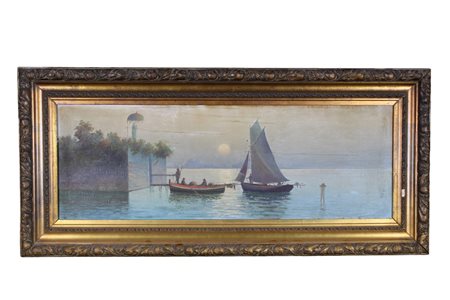 OLIO SU TELA Raffigurante Marina con barche e pescatori a firma Vincenzo Udine dentro cornice in legno dorato h cm 39,5 x 111 / cornice h cm 61 x 133