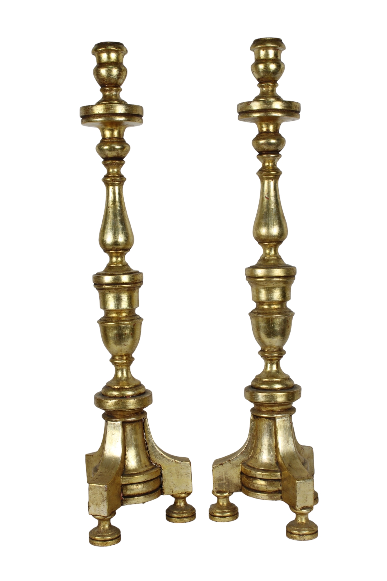 COPPIA TORCERI in legno tornito e dorato in argento e mecca Sicilia XVIII secolo h cm 78 x 21