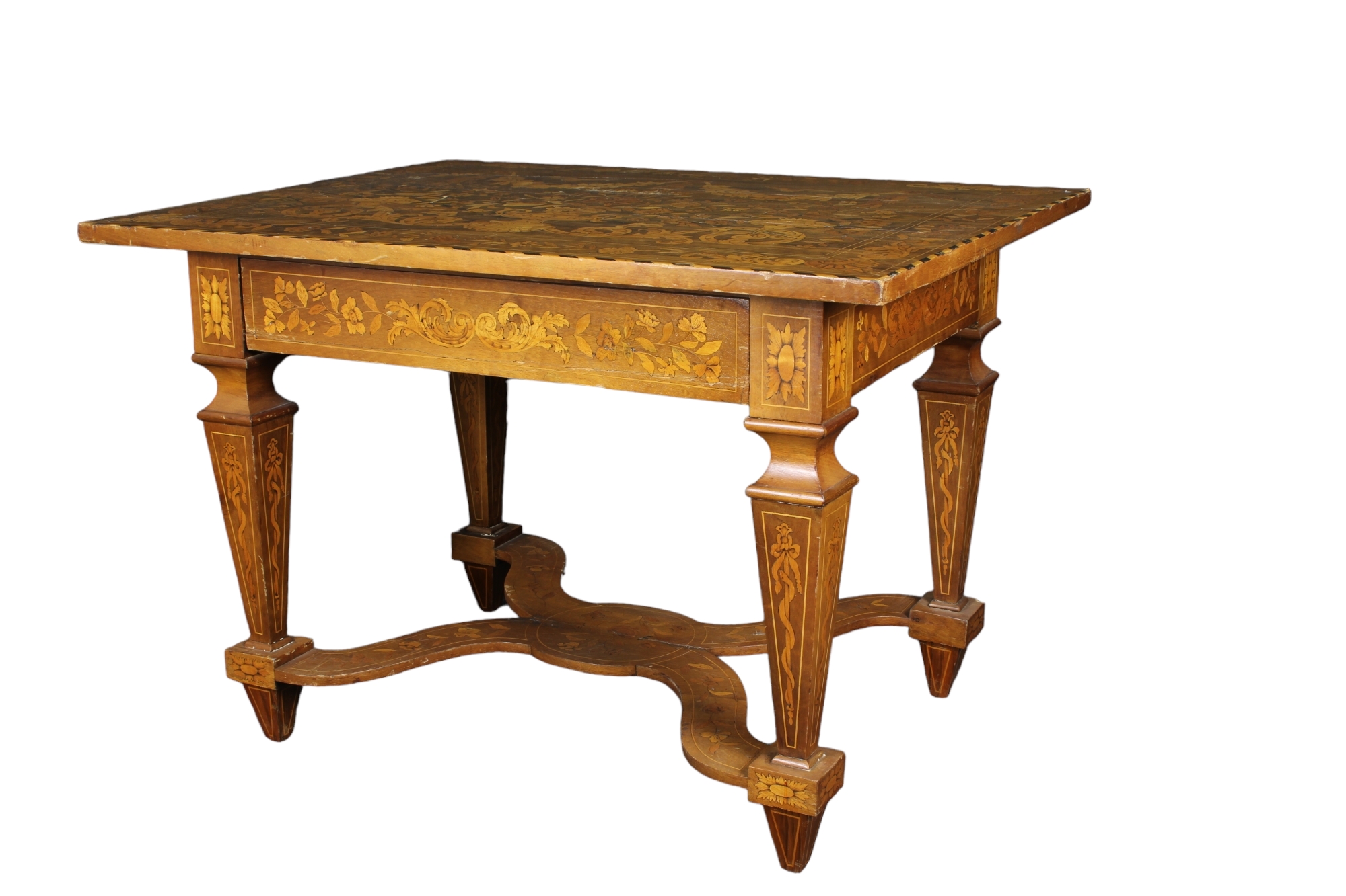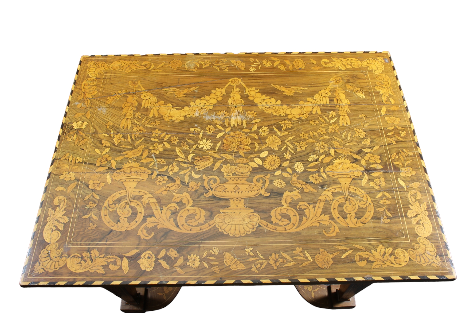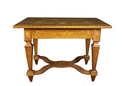 IMPORTANTE TAVOLO SCRITTOIO DA CENTRO in legno di palissandro e riccamente intarsiato in varie essenze a motivi di flora e fauna Olanda II metà del XVIII secolo h cm 75 x 109 x 81