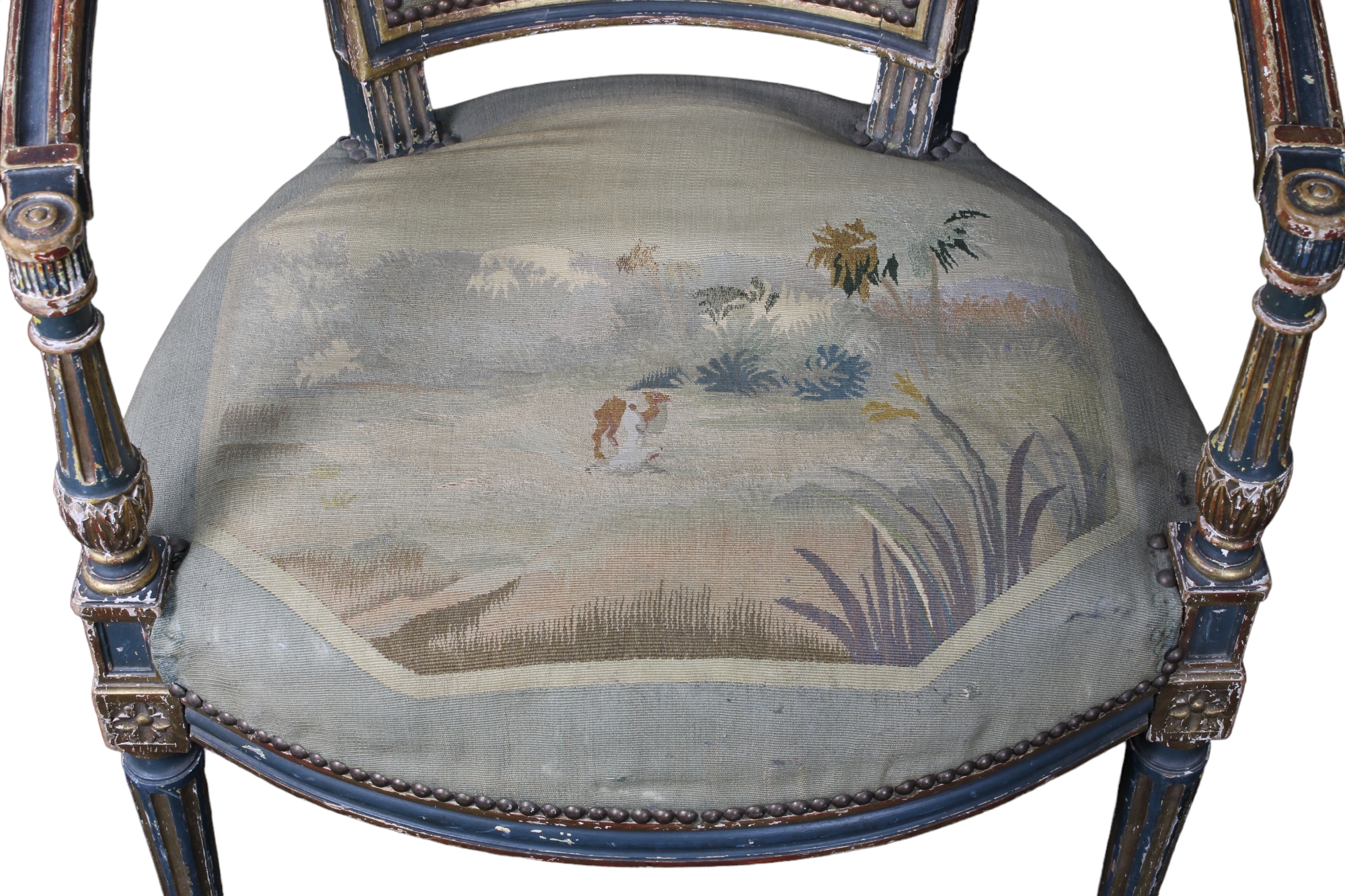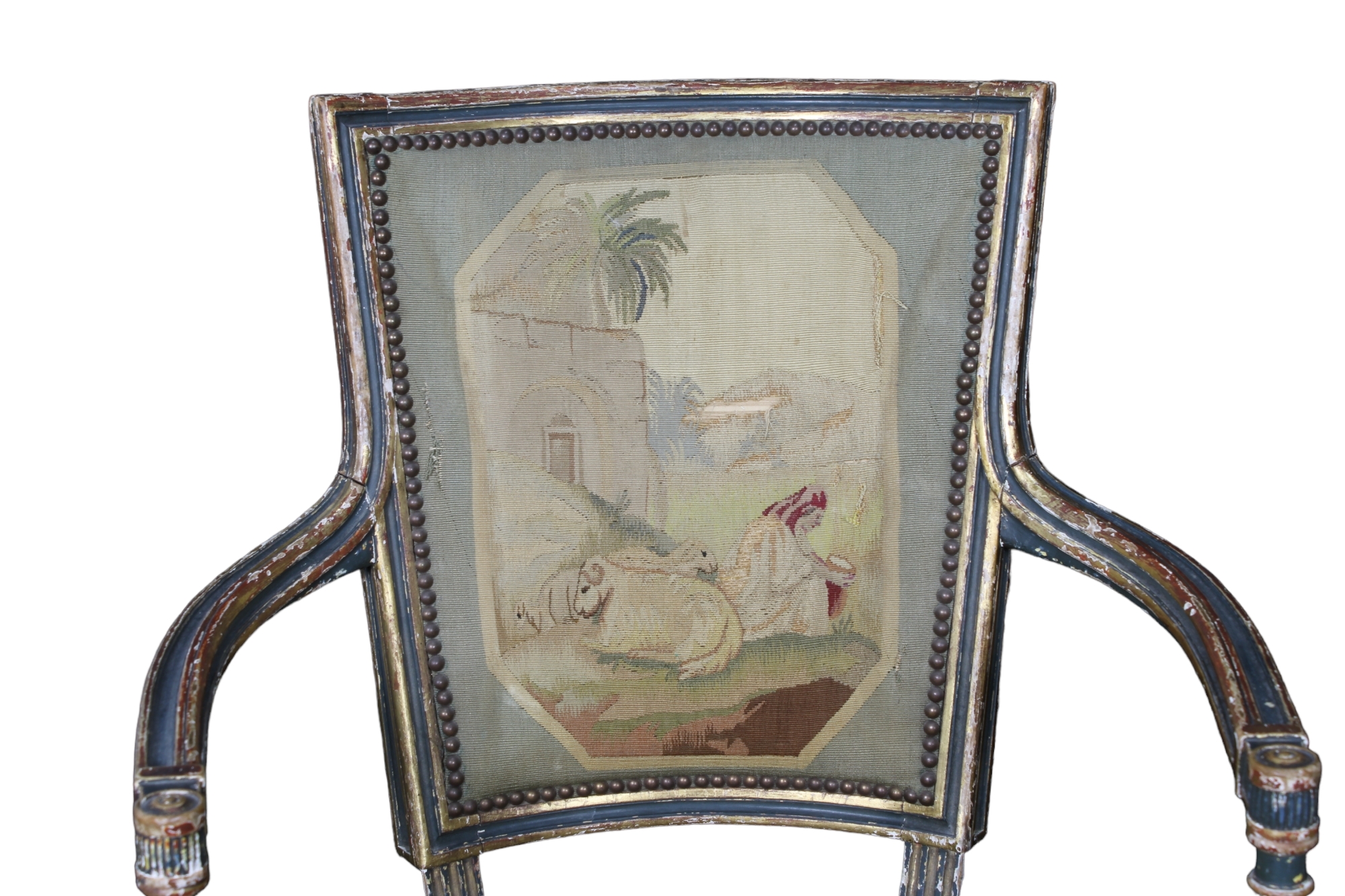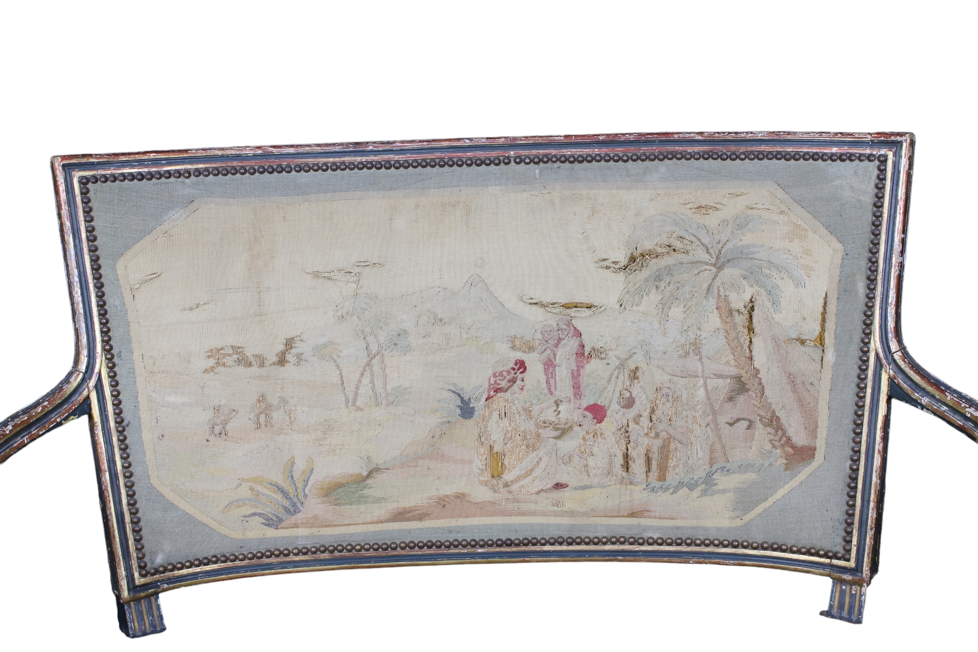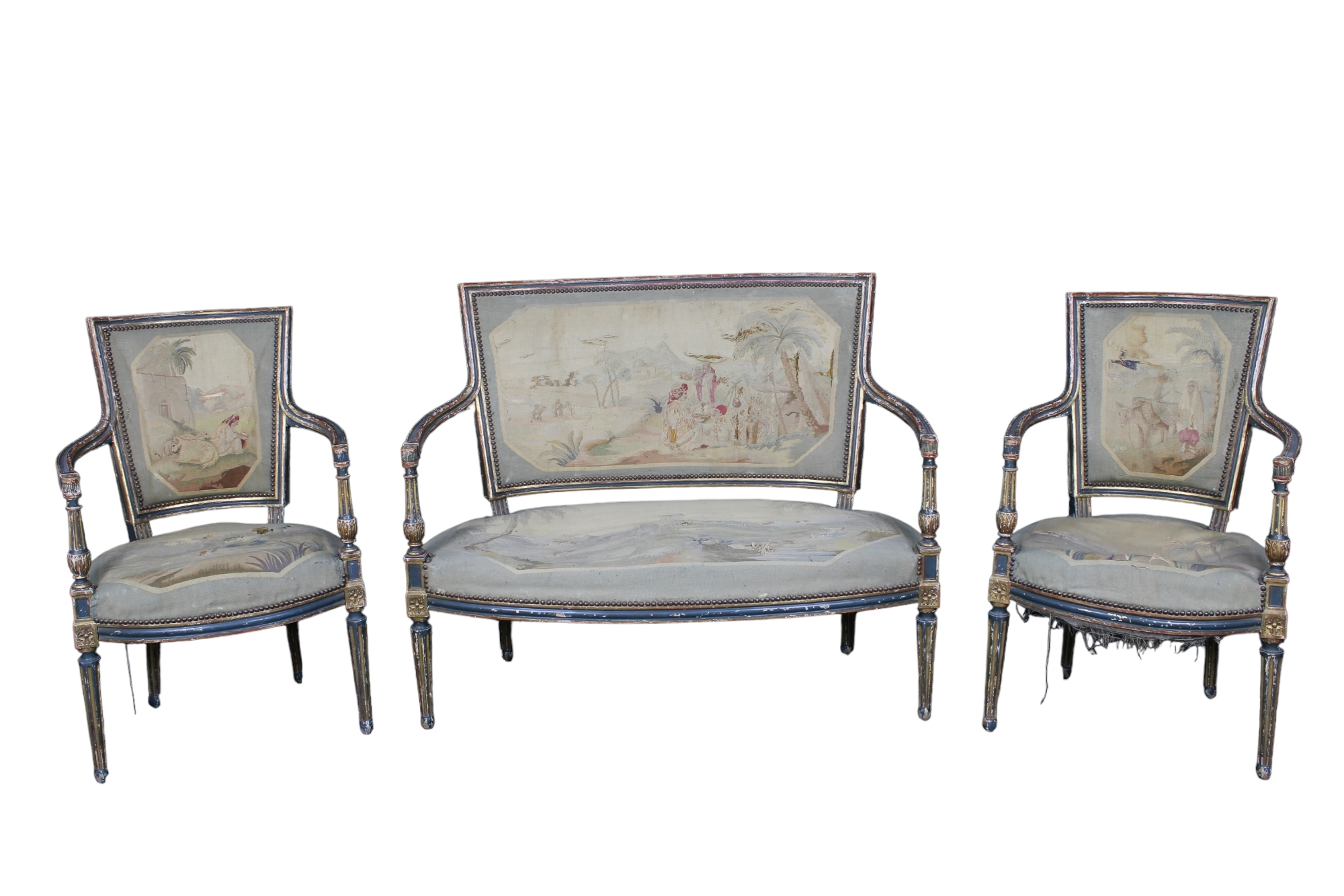 SALOTTO COMPOSTO DA: Divano e 2 poltrone in legno finemente scolpito, laccato a fondo verde e dorato con tappezzeria bousson Francia XVIII-XIX secolo h cm 92 x 111 x 58 / h cm 88 x 58 x 52