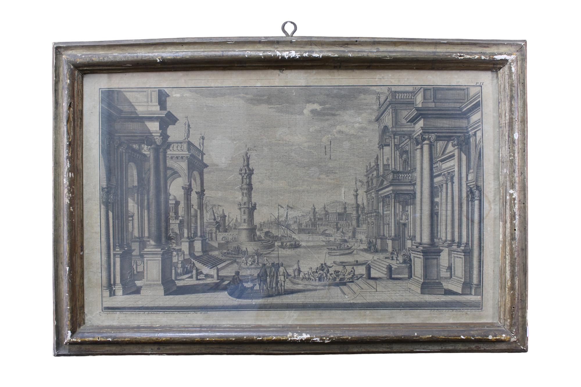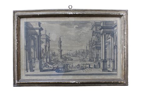 INCISIONE SU CARTA SUPPORTATA DA TELA Raffigurante Scena porto Reale, tratto da raccolta dei suoi disegni di studio e da lui pubblicata a Roma sotto la direzione di Andrea Pfeffel nel 1740-1744 con il titolo architetture e prospettive dedicate alla maestà di Carlo VI imperatore dei Romani di Giuseppe Galli Bibiena, suo primo ingegniere teatrale e architetto II metà del 700 h cm 41 x 62