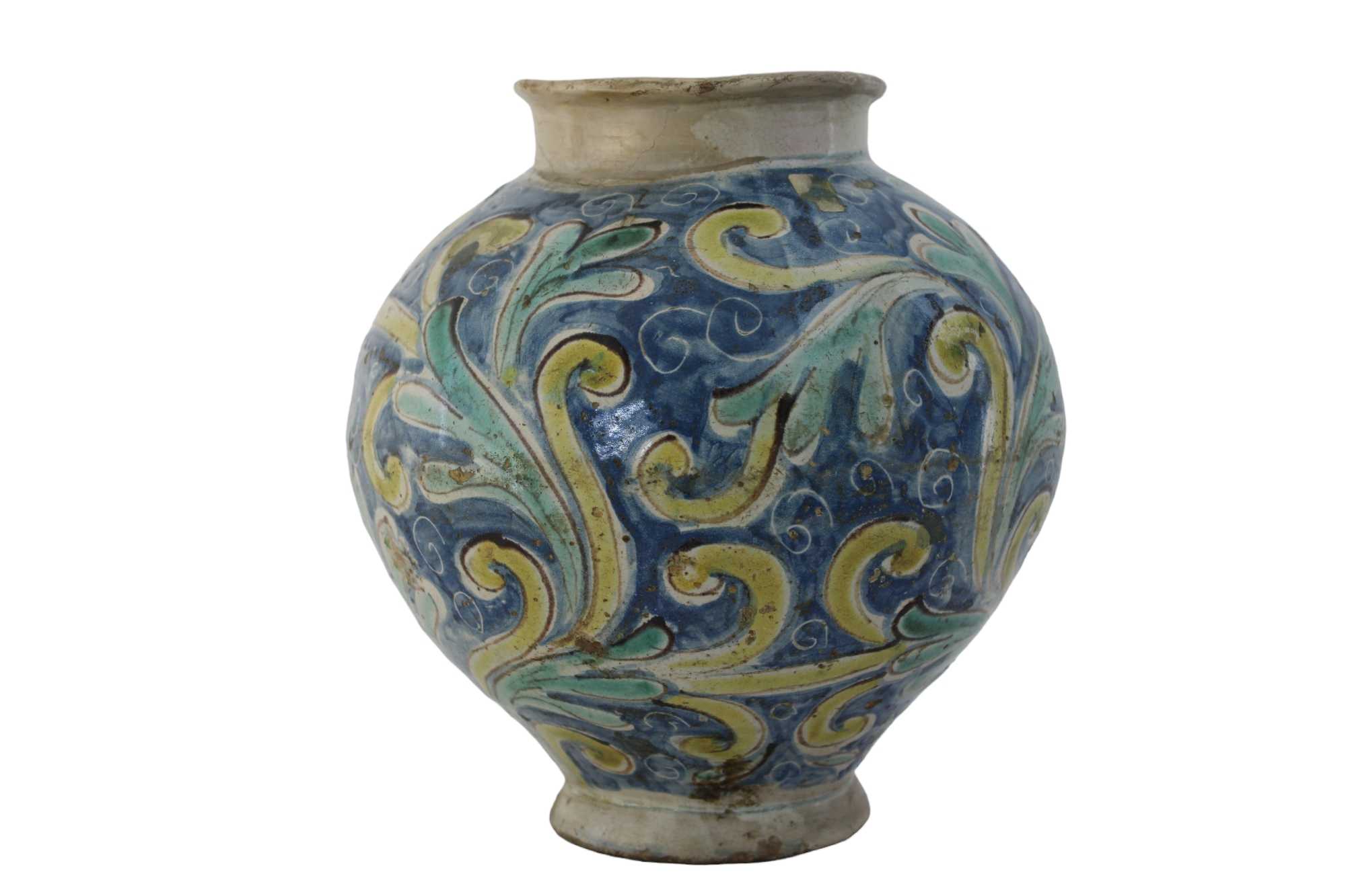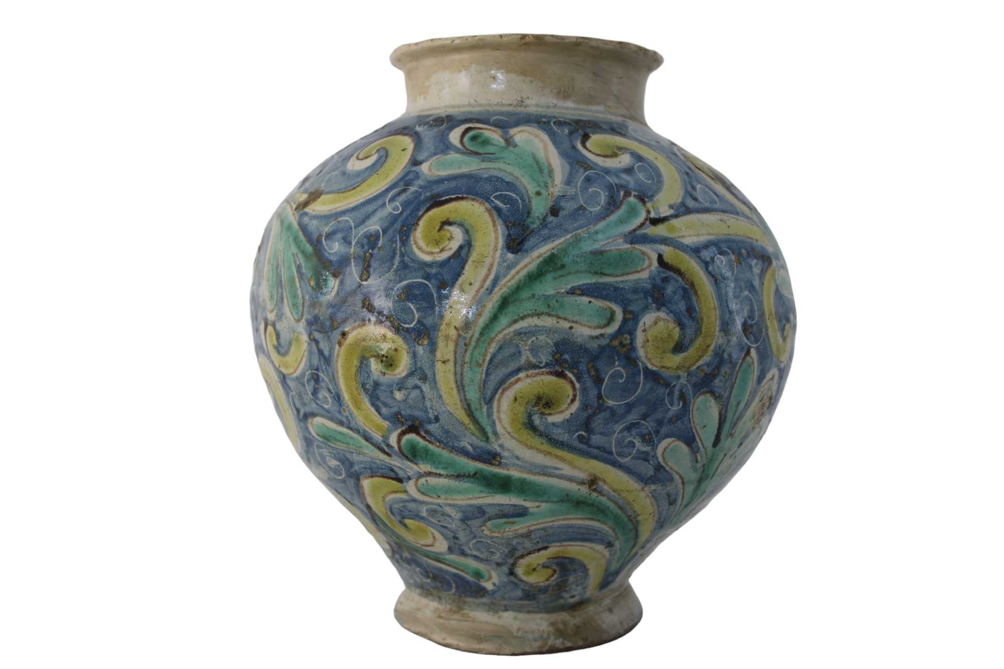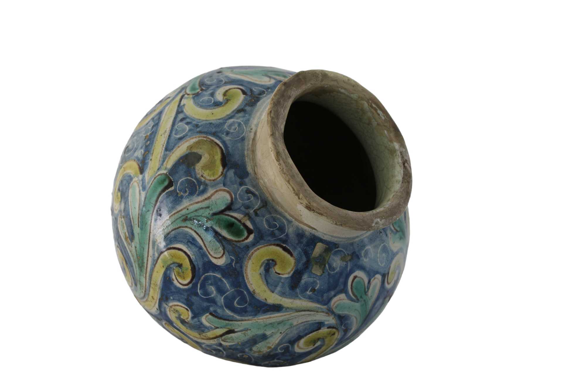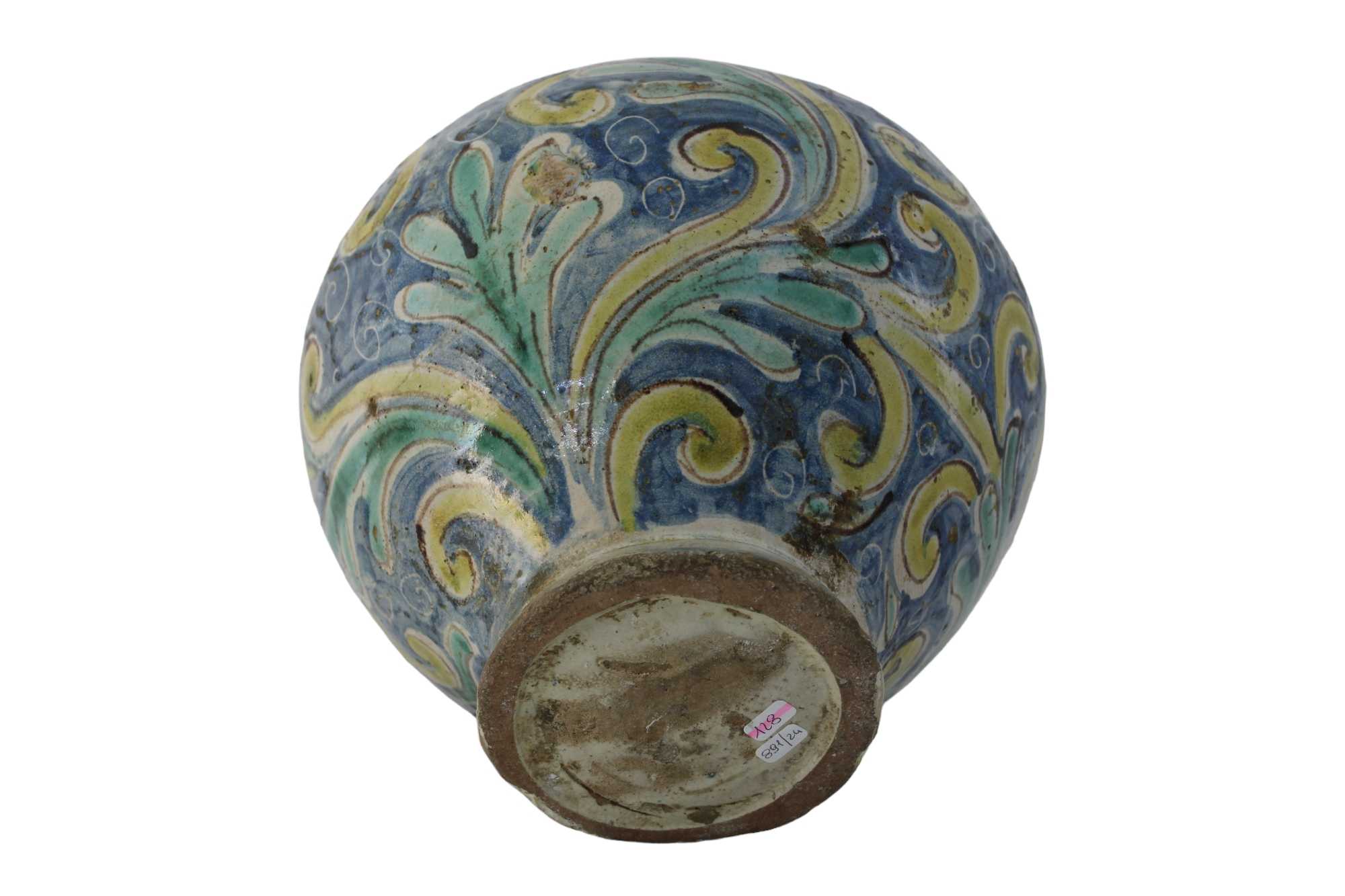 BOCCIA in maiolica policroma, dipinta a motivi floreali restauri sul bordo Caltagirone XVIII secolo h cm 25 x 22