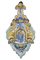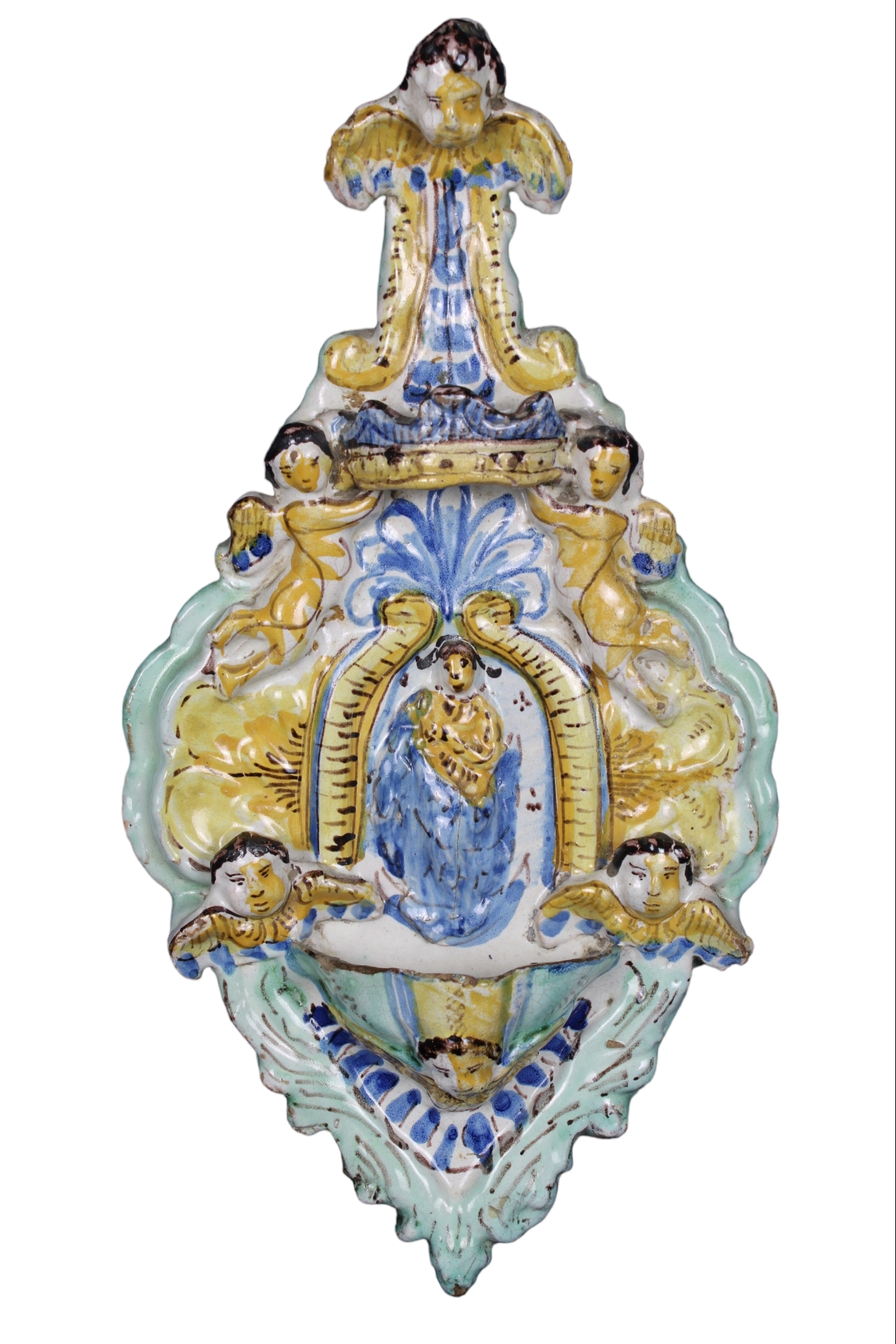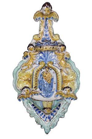 ACQUASANTIERA in maiolica policroma raffigurante Madonna, cherubini e angeli che sorreggono la corona Ariano Irpino XVIII secolo h cm 42 x 22 x 5