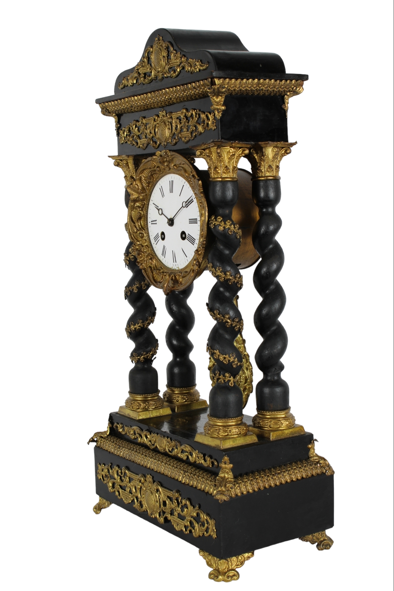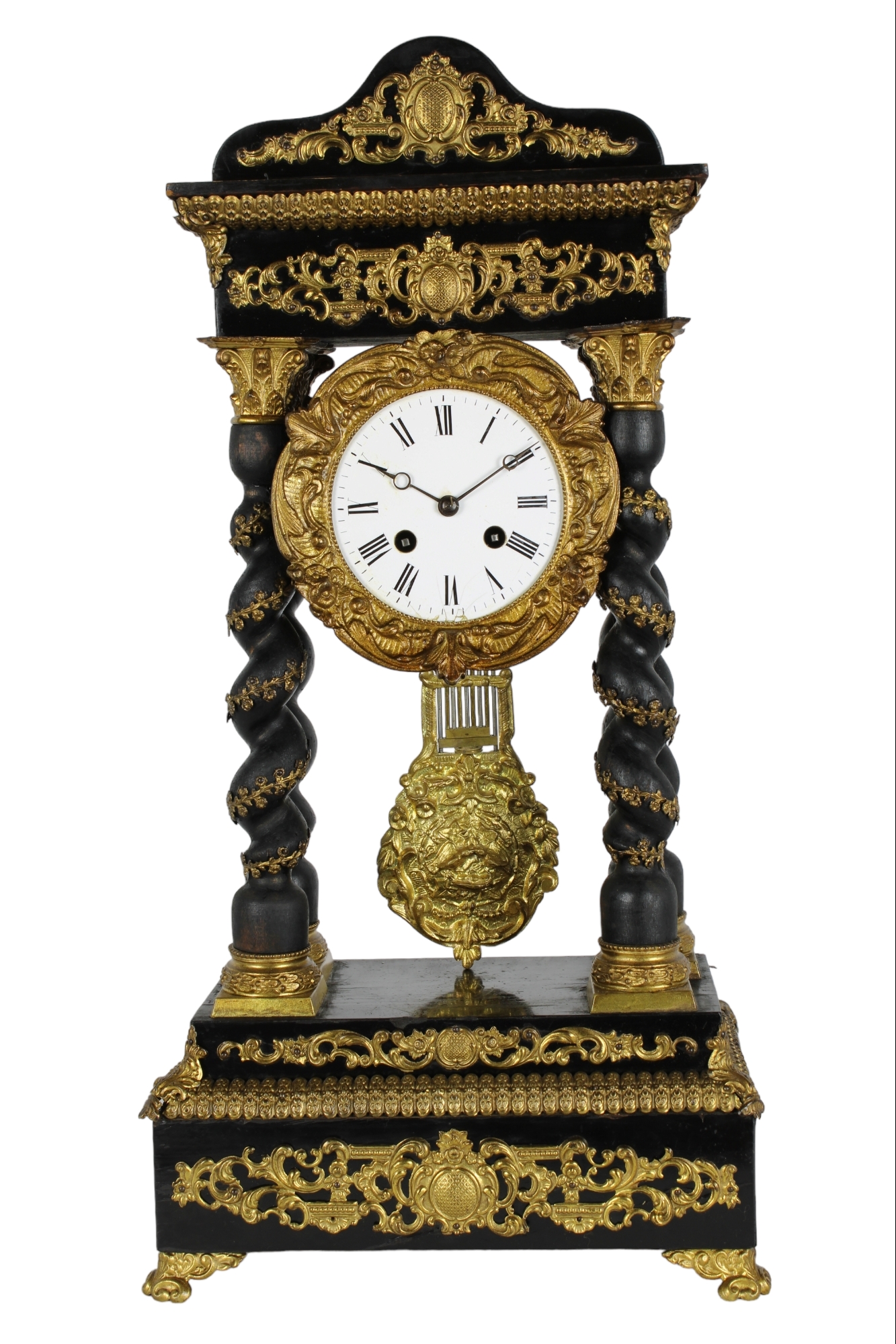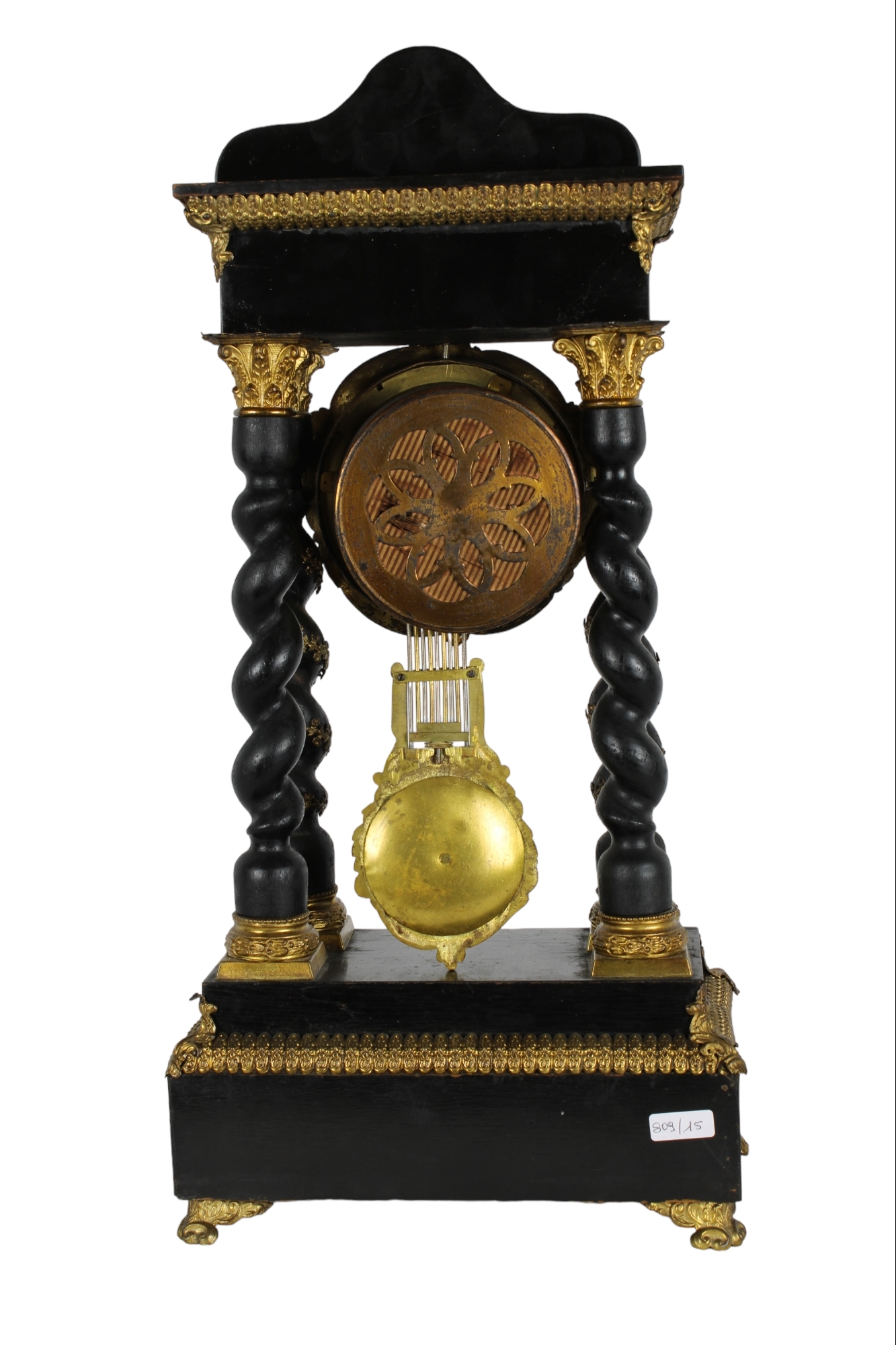 OROLOGIO A TEMPIETTO in legno ebanizzato, arricchito da applicazioni in bronzo finemente cesellato e dorato Francia XIX secolo h cm 52 x 26 x 14