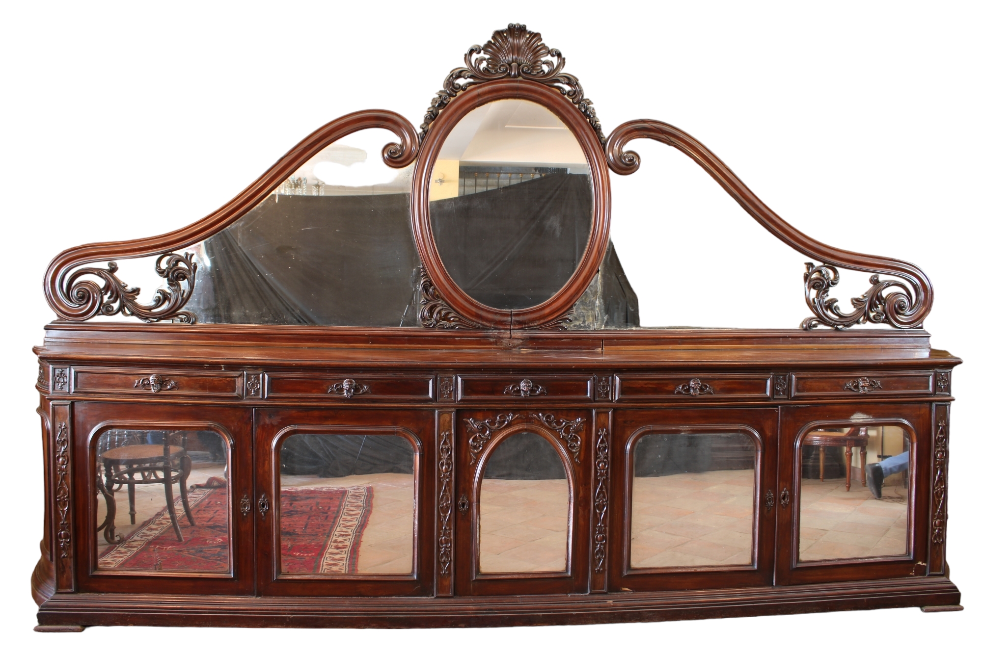 IMPORTANTE CREDENZA LUIGI FILIPPO in mogano a 7 ante di cui 2 negli angoli scantonati e 5 frontali con specchi e fregi, piano in legno con grande specchiera riccamente intagliata divisa in 3 sezioni di cui la centrale ovale con fregio e cuspide XIX secolo genova h cm 260 x 430 x 70