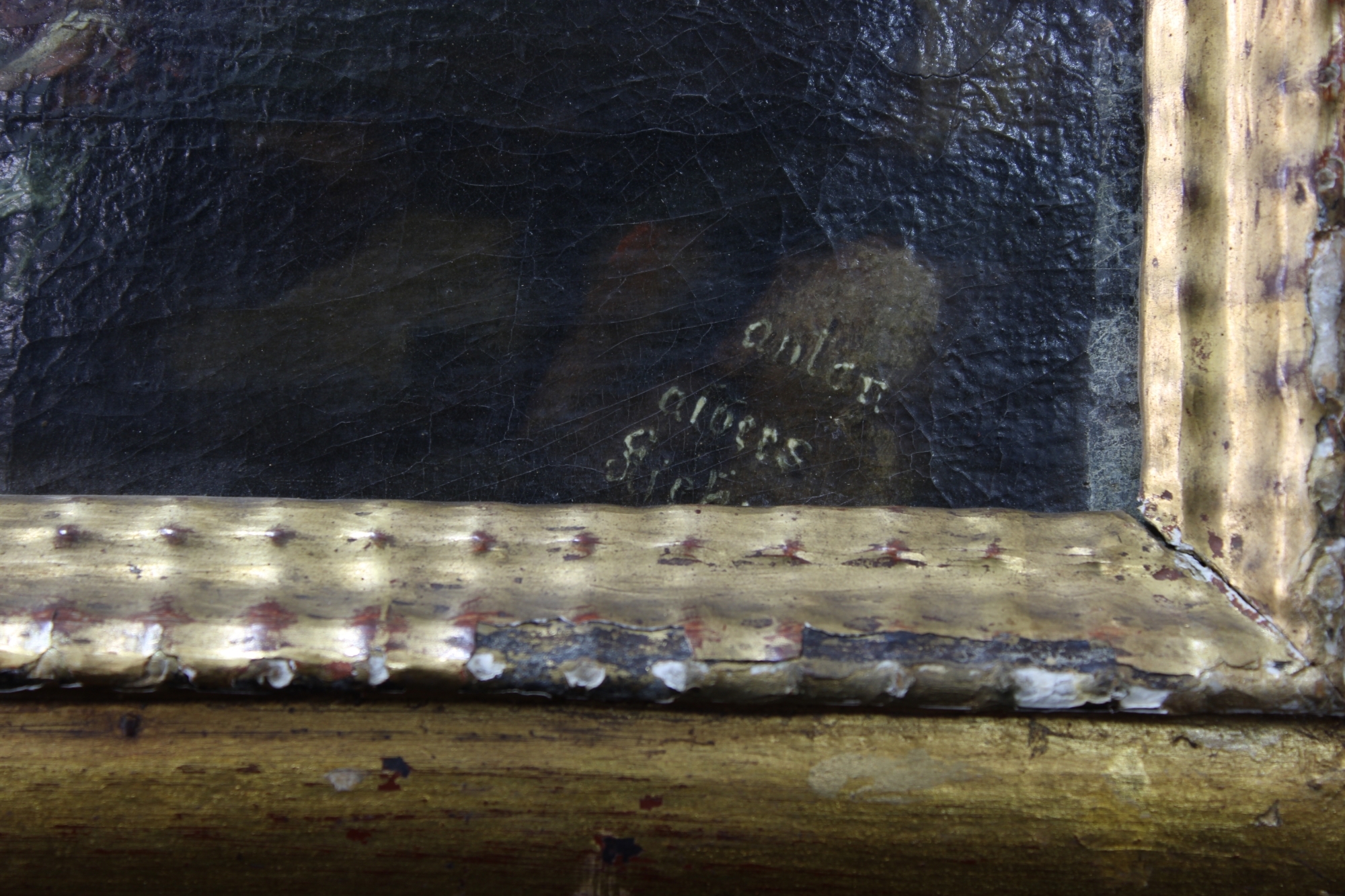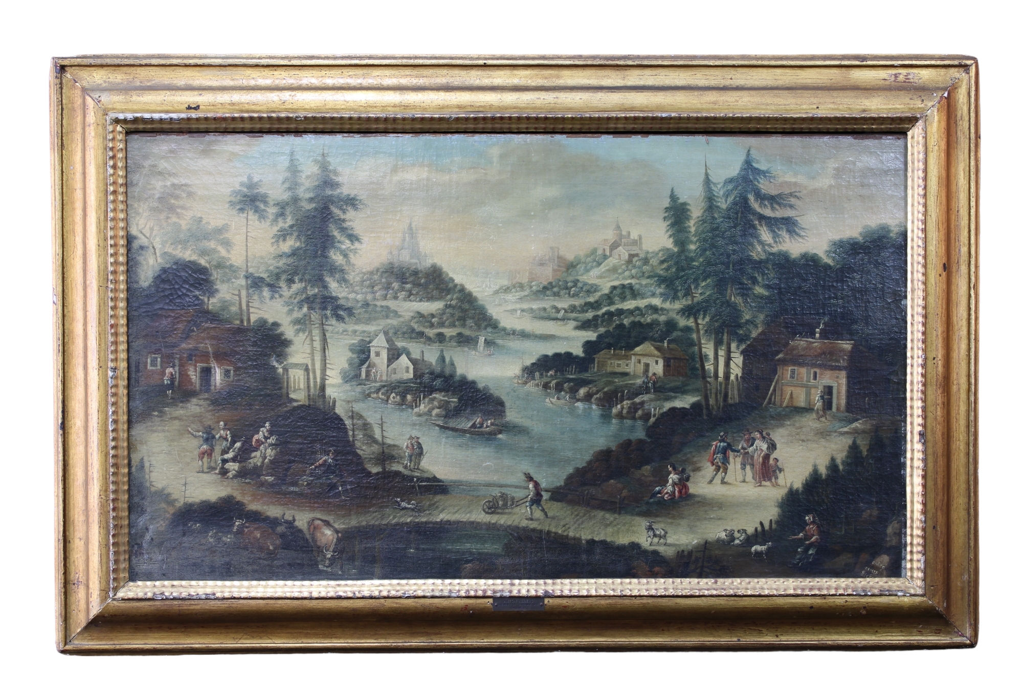 DIPINTO OLIO SU TELA Raffigurante scena di vita di un borgo lacustre fiammingo, firmato in basso a destra Anton Albus Bremen 1765 Laousanne 1844, cornice dorata h cm 54 x 97 / cornice h cm 71 x 110
