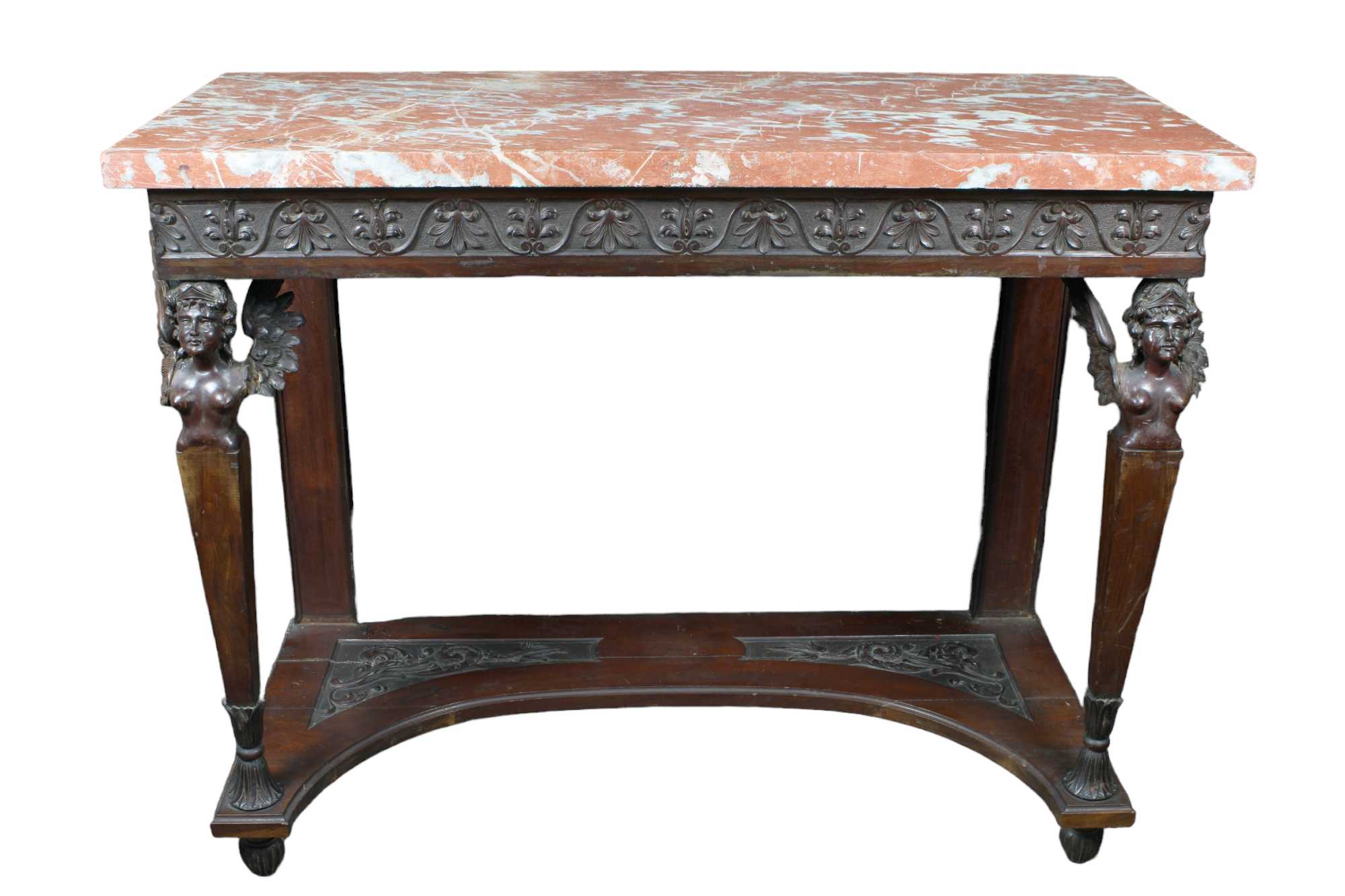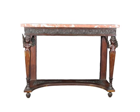 CONSOLLE in mogano, finemente scolpita con gambe raffigurante donne alate, piano in marmo rosso di Francia maestranze venete XIX secolo h cm 105 x 134 x 57