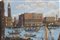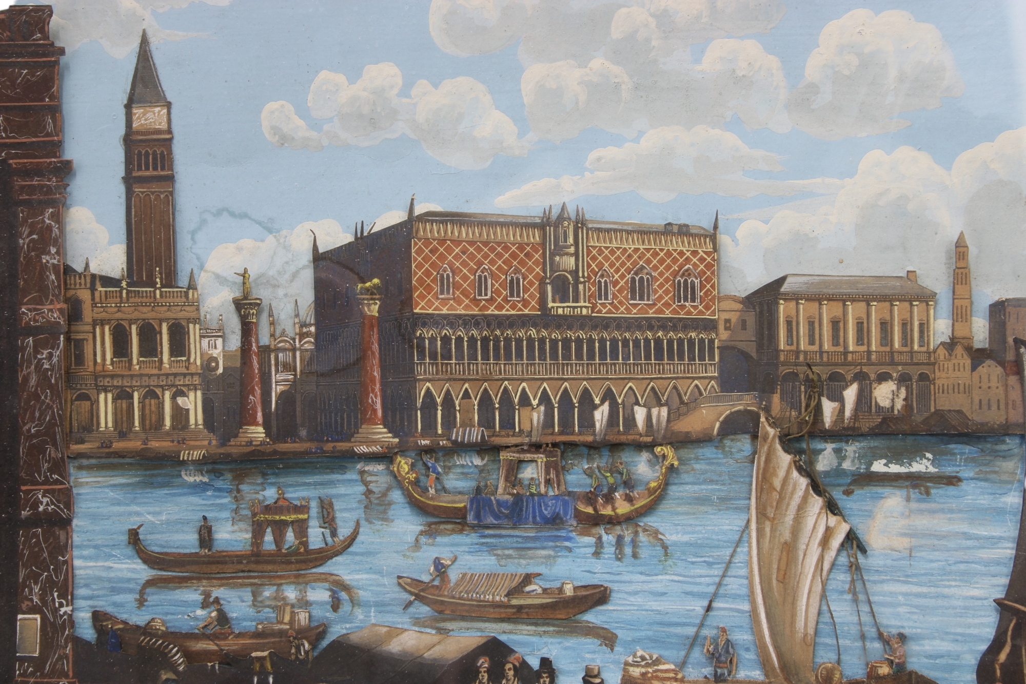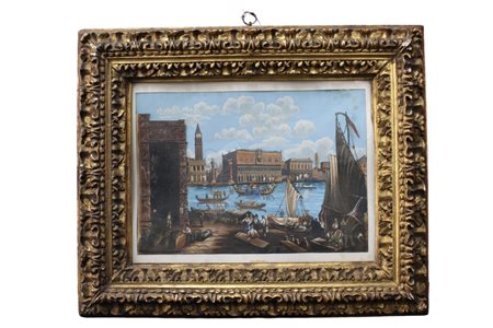 DIORAMA SU CARTA ACQUERELLATA Raffigurante Canal Grande di Venezia con vista del palazzo Ca D'oro, dentro bella cornice in legno intagliato e dorato Primi 800 Italia h cm 35 x 50 / cornice h cm 60 x 72