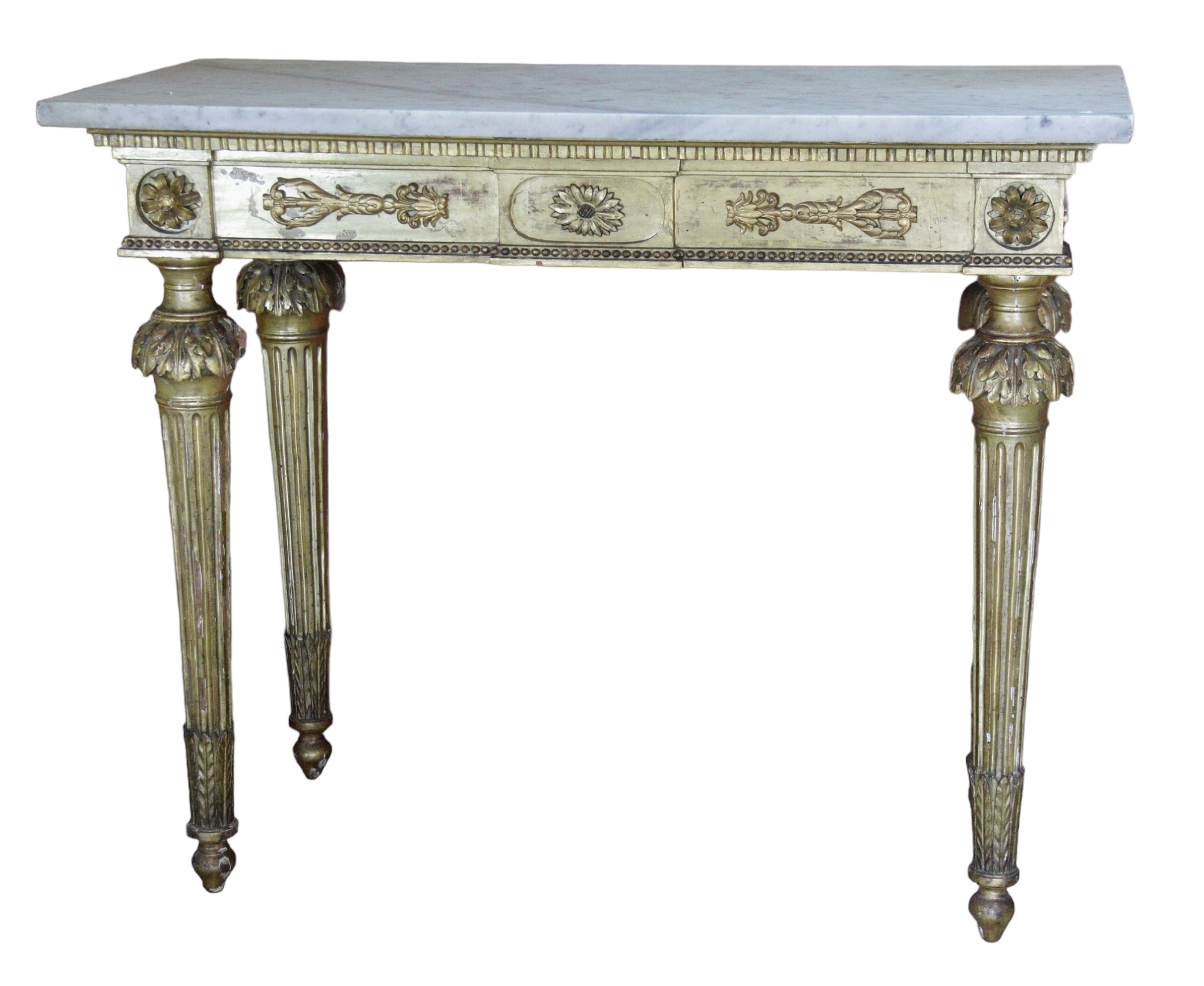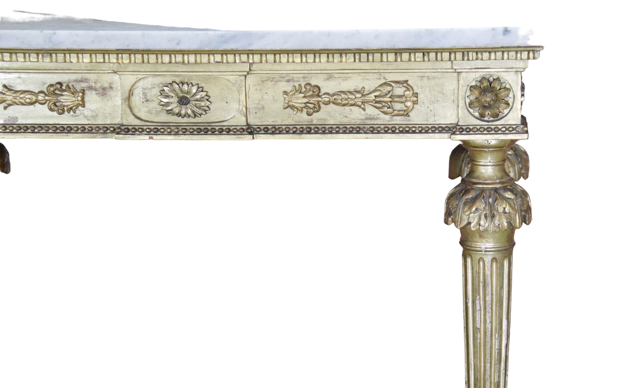 CONSOLLE LUIGI XVI in legno riccamente intagliato e dorato ad oro zecchino, piano in marmo bianco di Carrara Genova 1780/1810 h cm 100 x 119 x 60