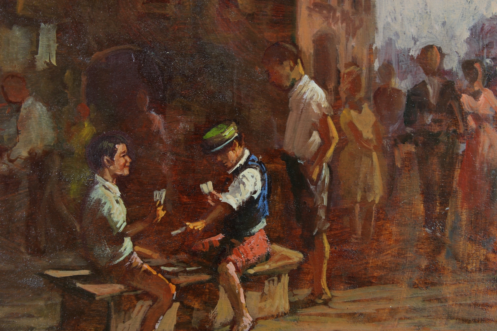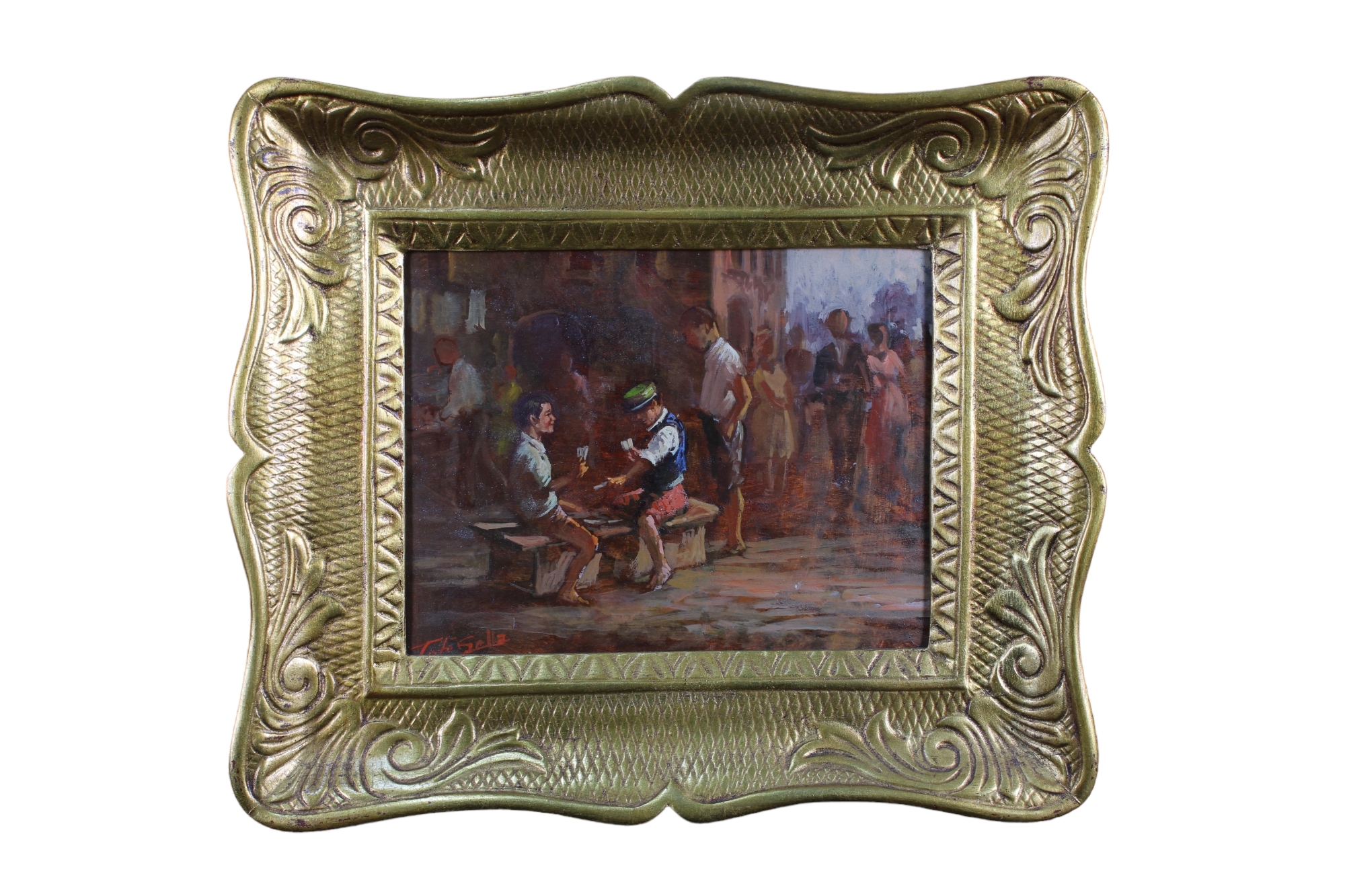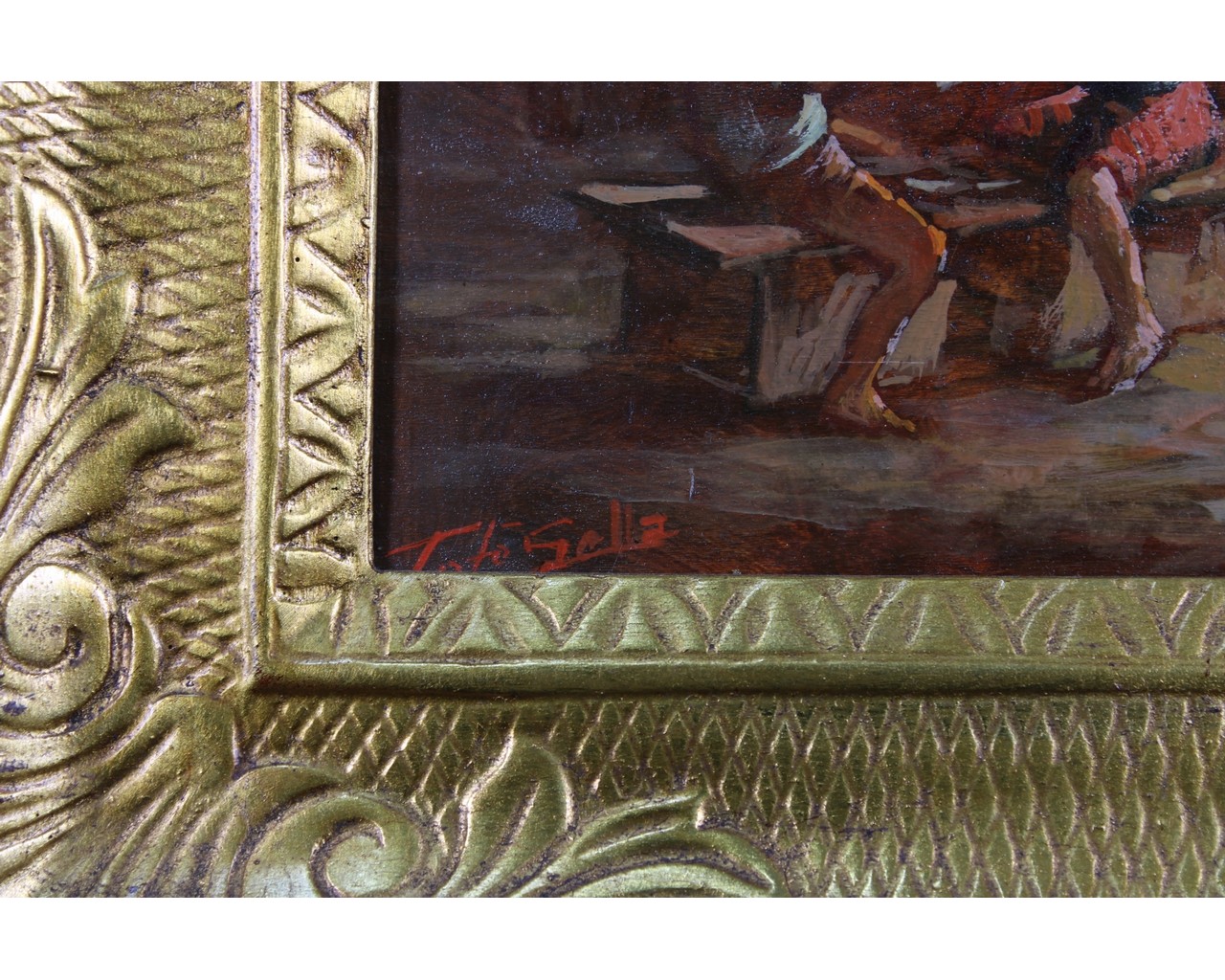 OLIO SU COMPENSATO Raffigurante scene di vita e giocatori di carte, reca firma Totò Sella dentro cornice a guantiera XX secolo h cm 24 x 30 / cornice h cm 38,5 x 45,5