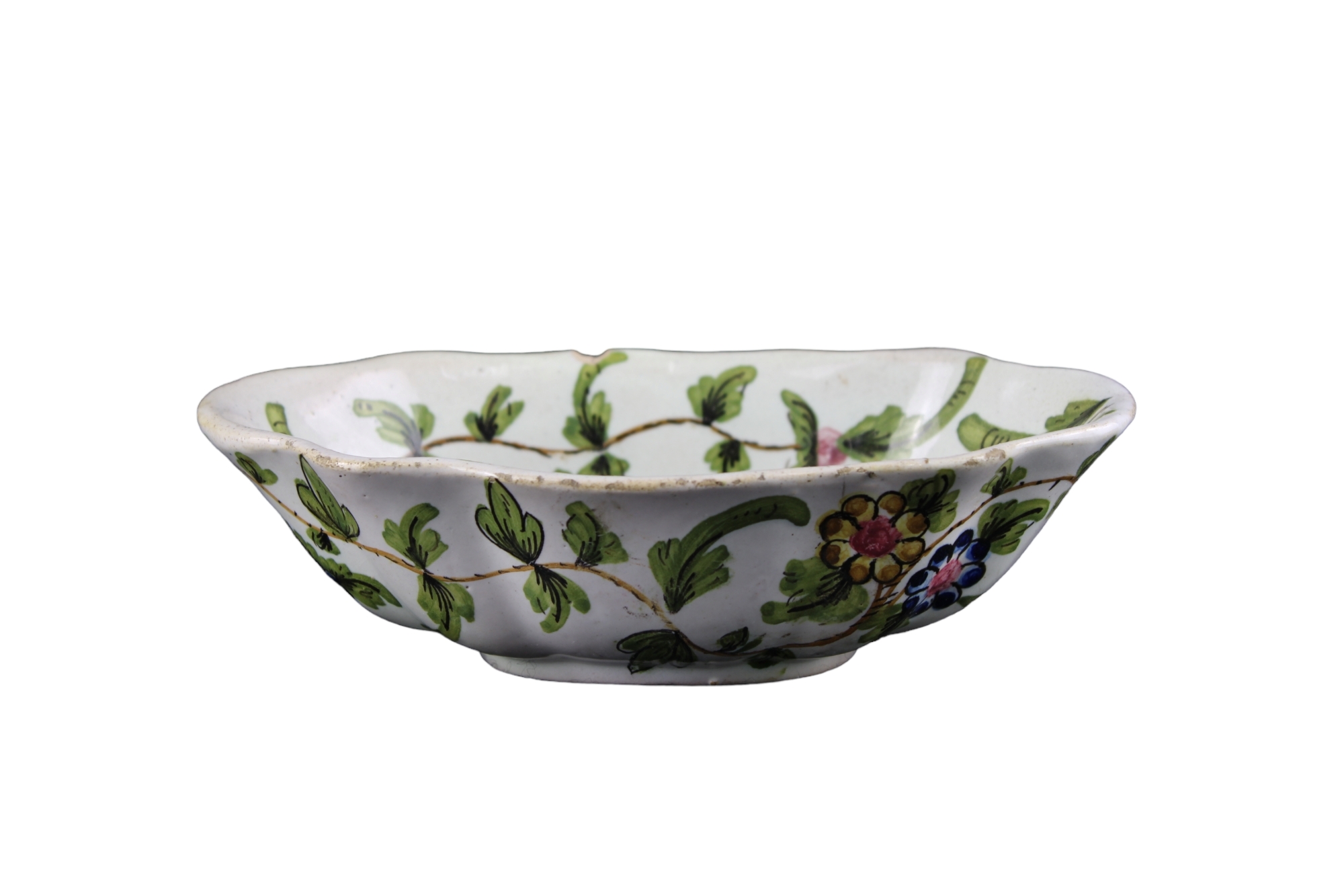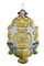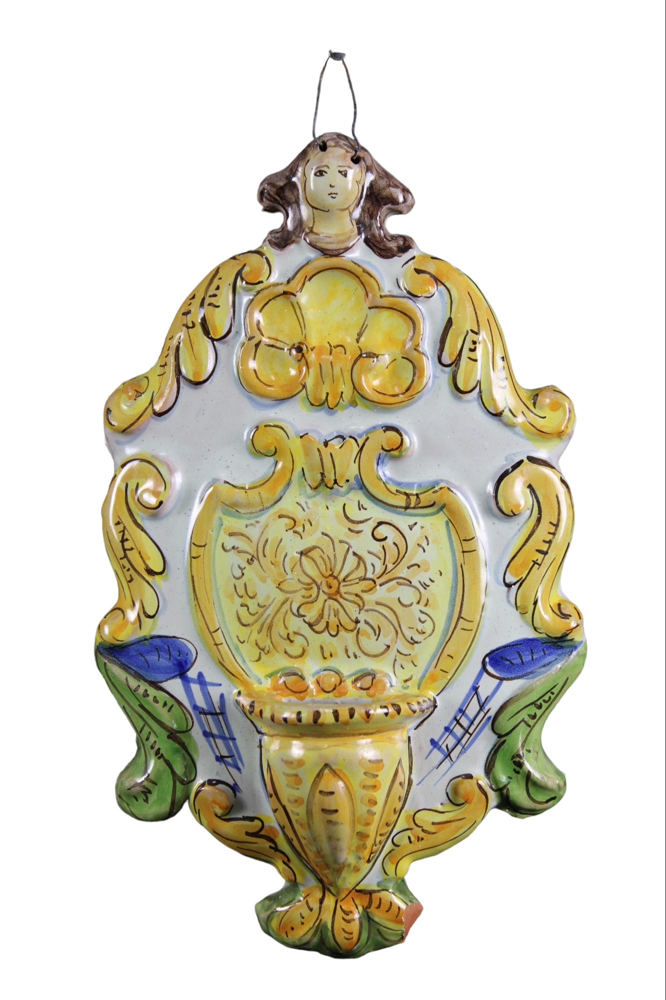 LOTTO COMPOSTO DA: 1 MENSOLA in legno di noce con placca in ceramica decorata, 1 ACQUASANTIERA in maiolica dipinta La Nusa e 1 CIOTOLA in maiolica dipinta a motivi floreali, Pescara varie manifatture XIX - XX secolo misure varie
