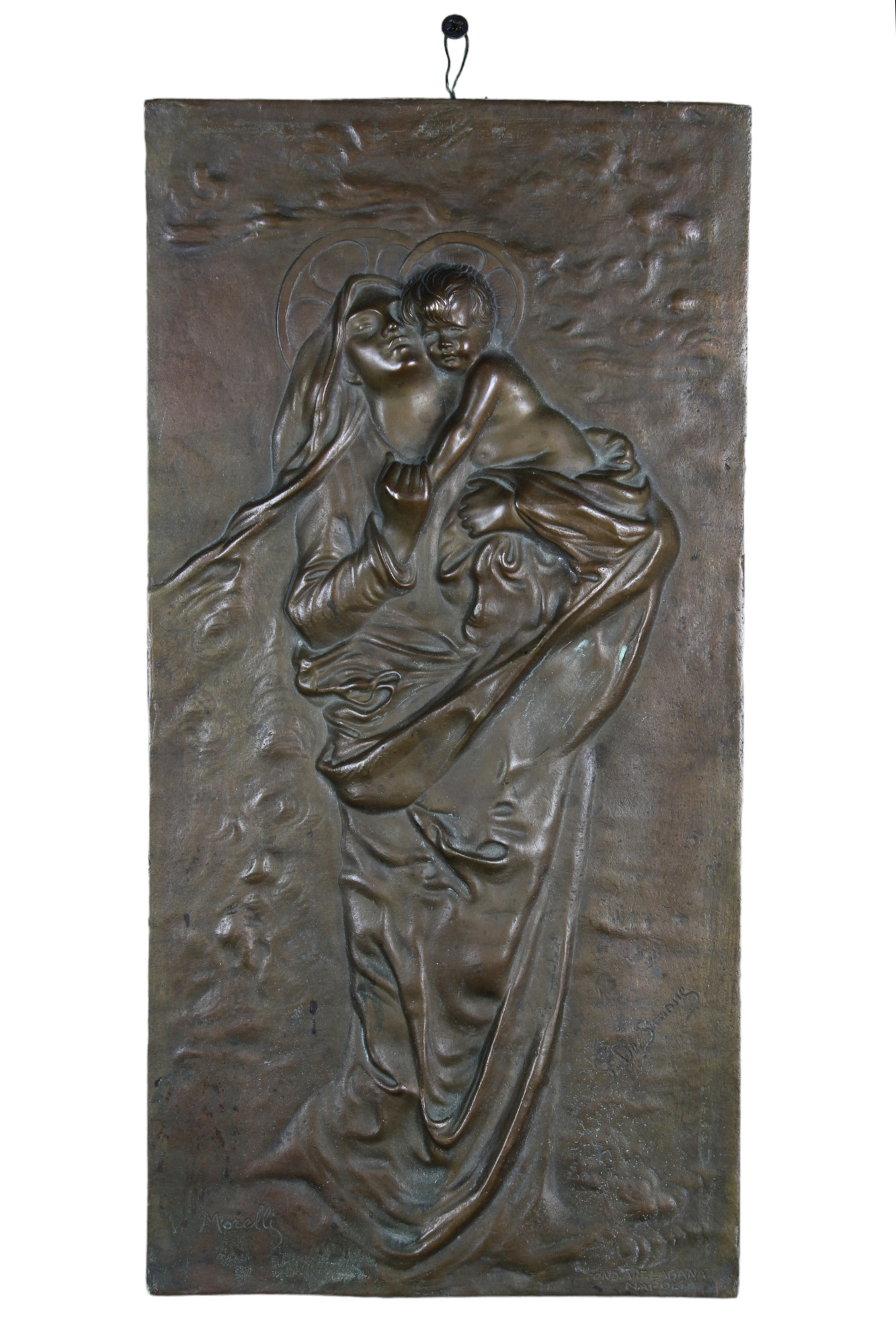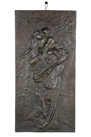 BASSORILIEVO in bronzo patinato raffigurante Madonna con Bambino firmata S. De Simone Morelli fonderia La Gronà Napoli XIX - XX secolo h cm 44 x 22
