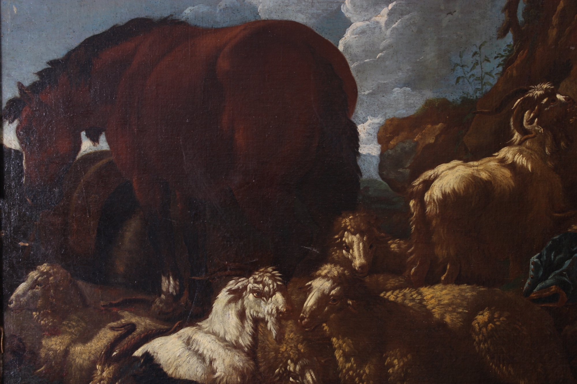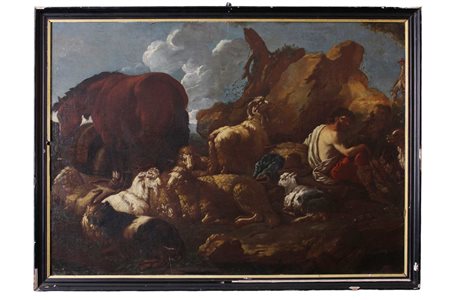 OLIO SU TELA Raffigurante Paesaggio con pastore e armenti attribuibile a Piter Rouser detto Rossa da Tivoli h cm 110 x 150 / cornice h cm 116 x 159