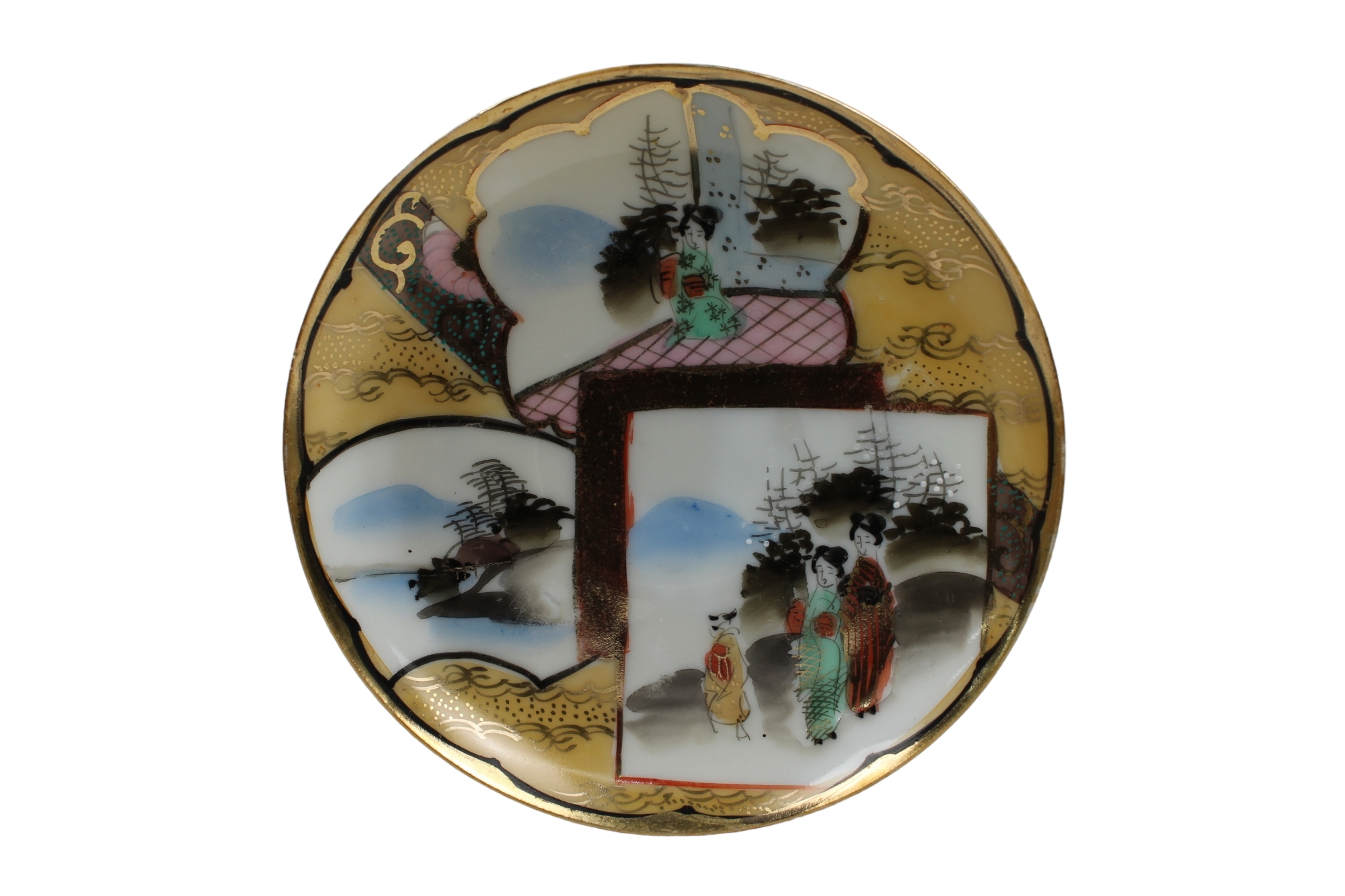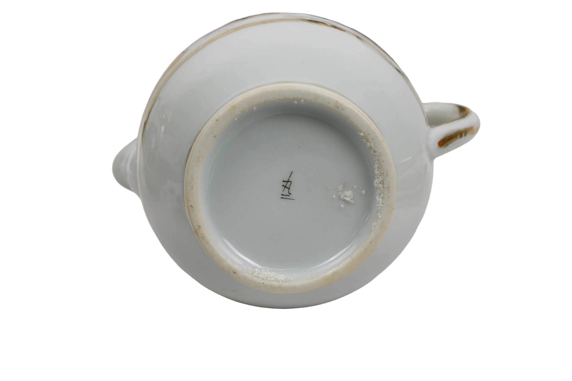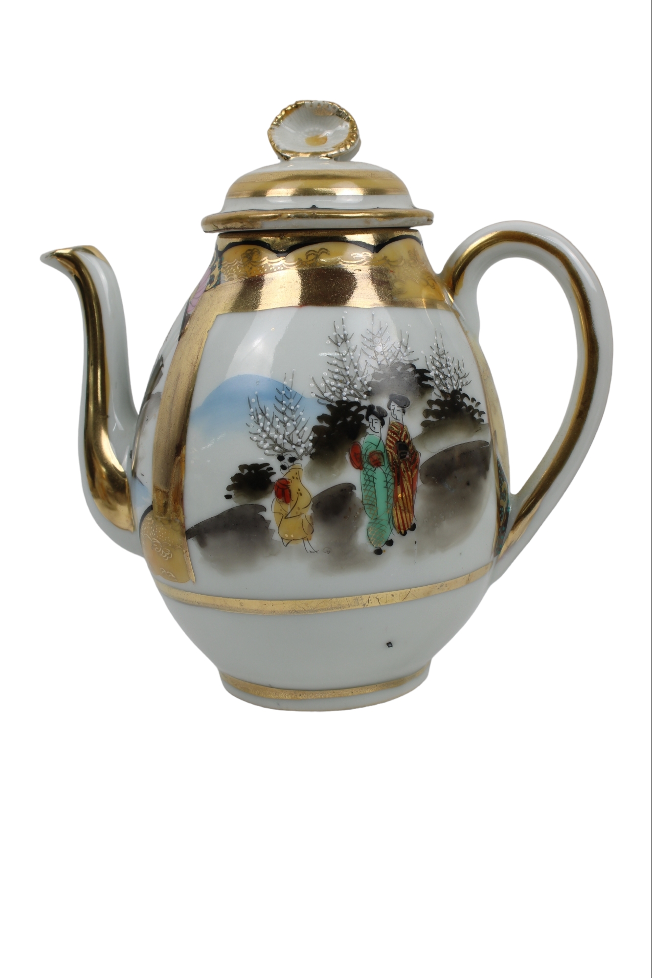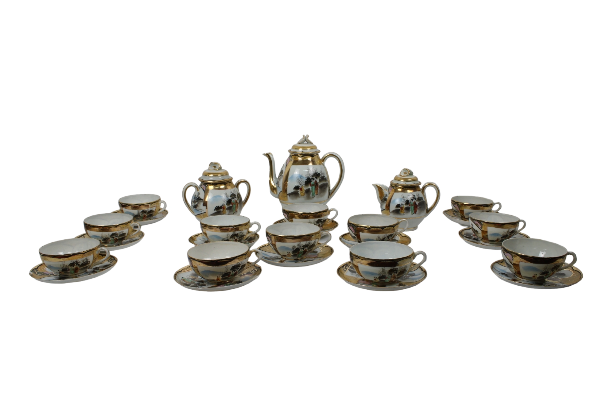 SERVIZIO DA CAFFE COMPOSTO DA: lattiera, zuccheriera e caffettiere, 12 tazze con piattino dipinto a motivi paesaggi con personaggi e lumeggiature in oro di gusto orientale XX secolo misure varie