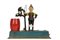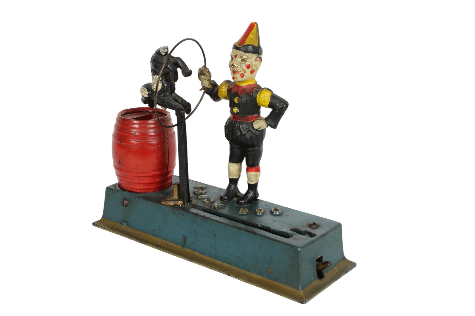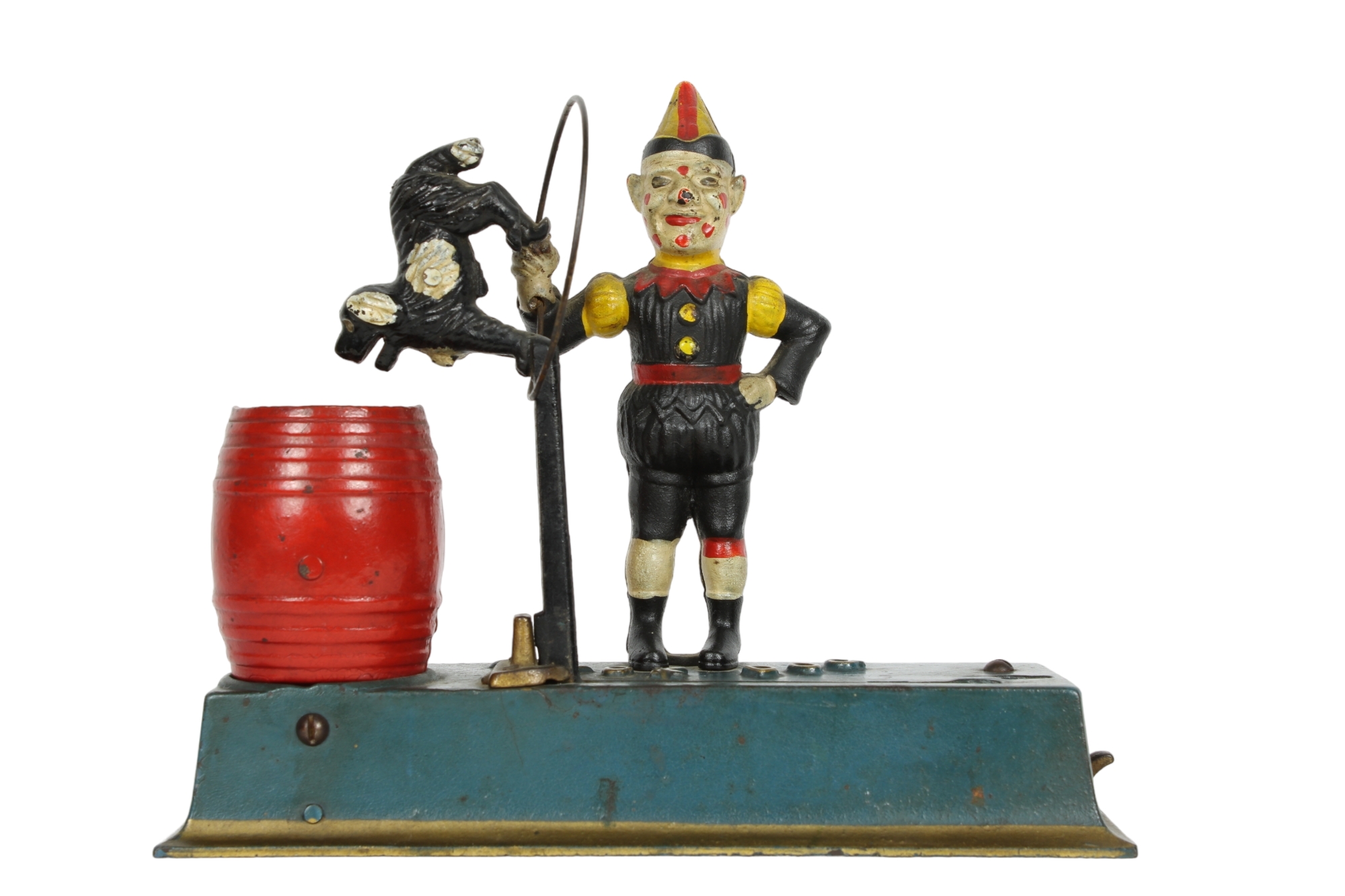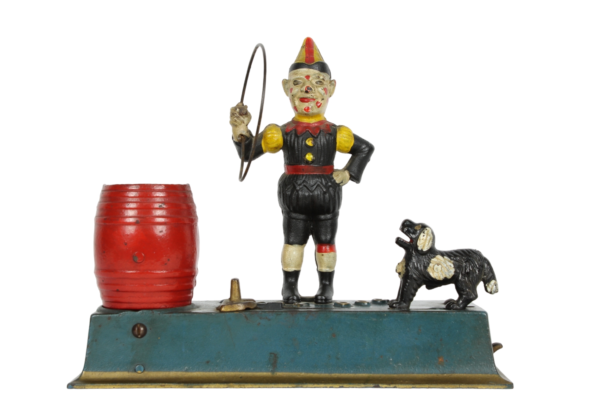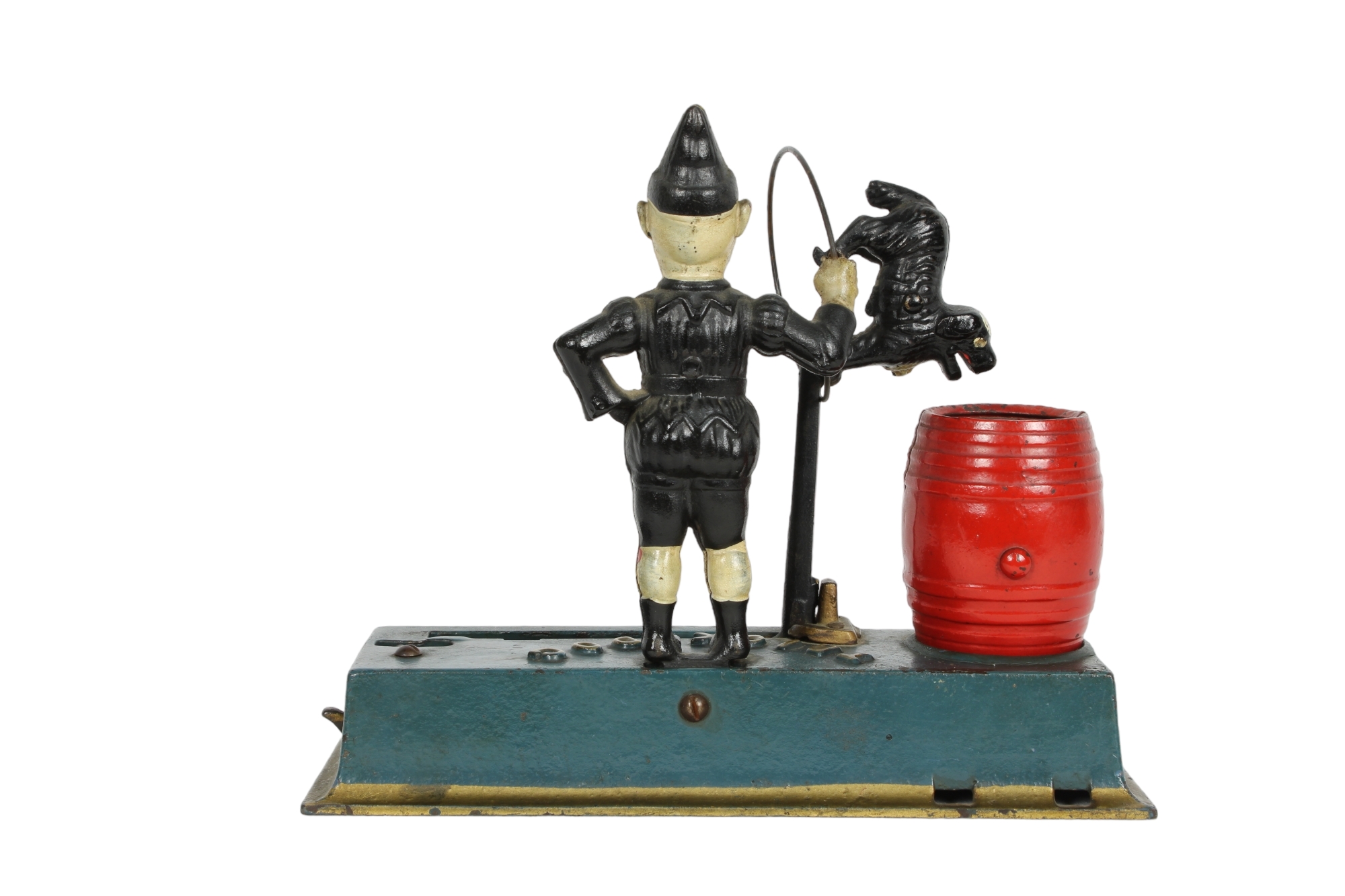 SALVADANAIO in ghisa, meccanico vintage Trick Dog manifattura USA XIX secolo h cm 18 x 22 x 8