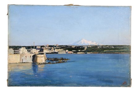 OLIO SU TELA Raffigurante Veduta di Siracusa dal mare con l'Etna sul fondo datato 1893 h cm 25 x 38