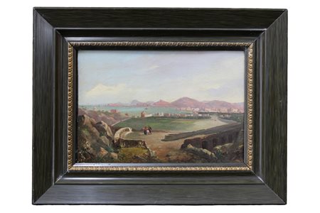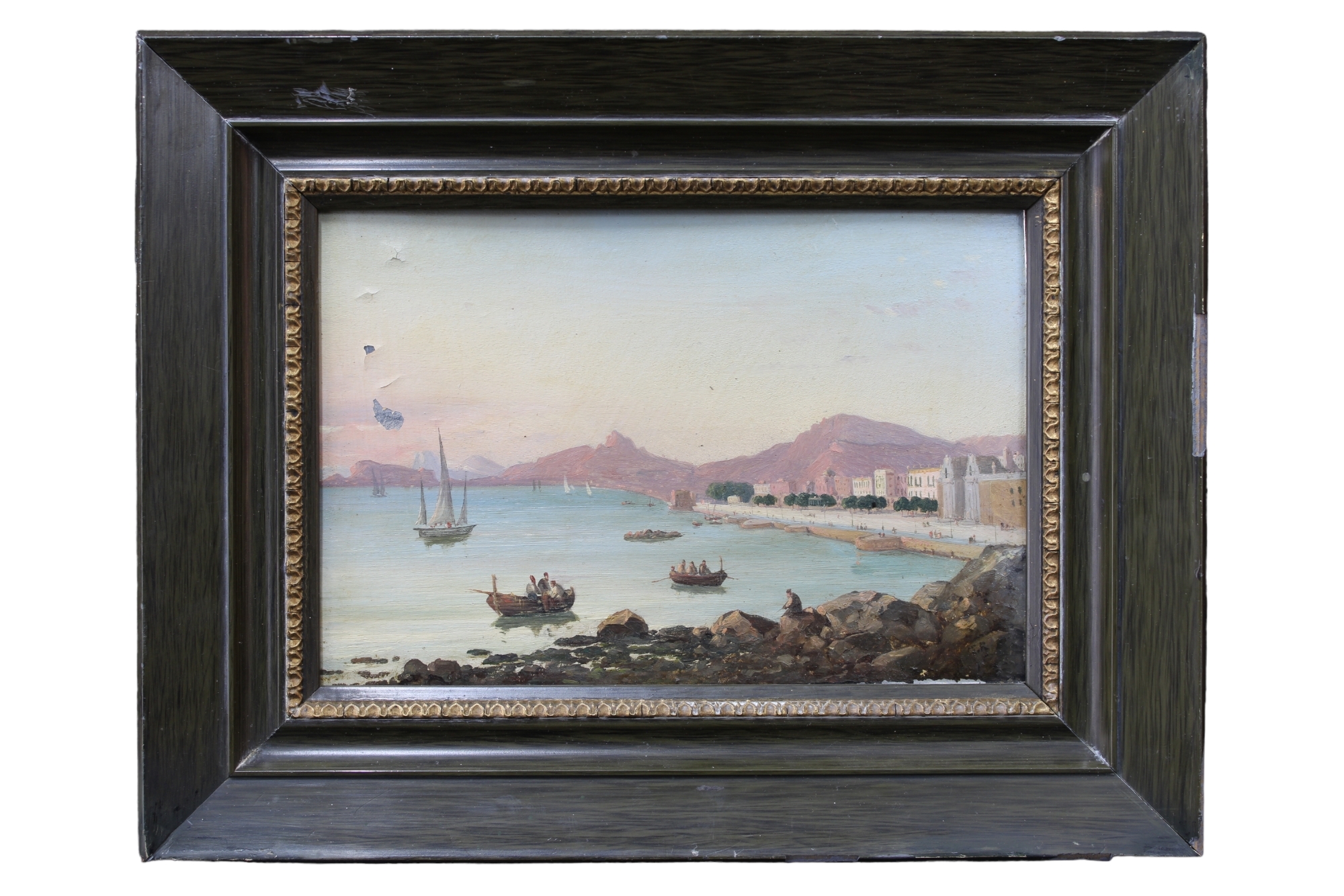 COPPIA DI PAESAGGI MARINI dipinti su lastra di metallo scuola italiana XIX secolo h cm 15 x 22 / cornice h cm 25 x 32