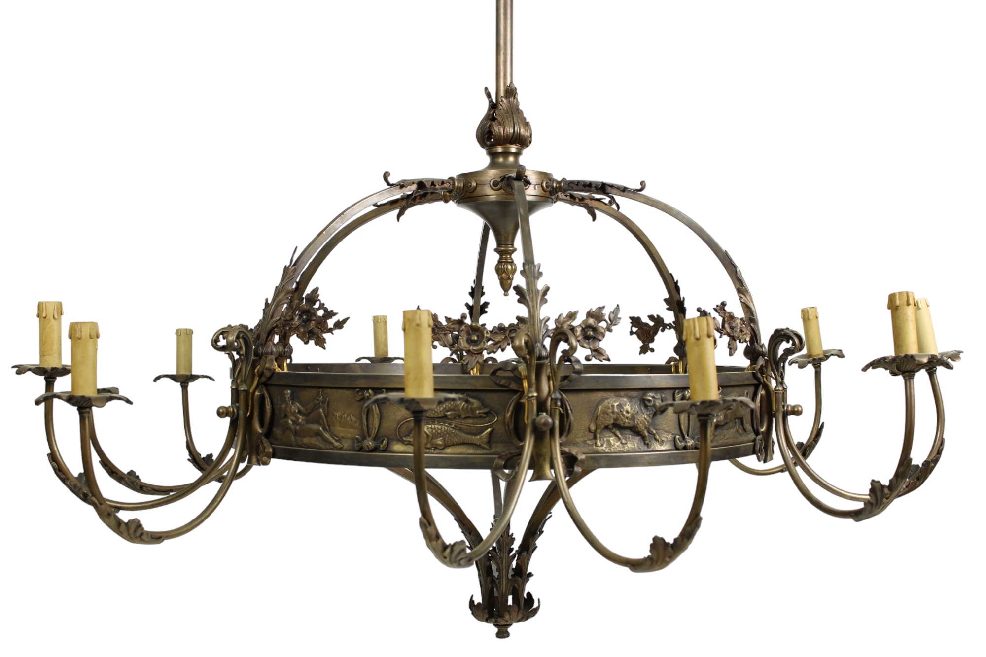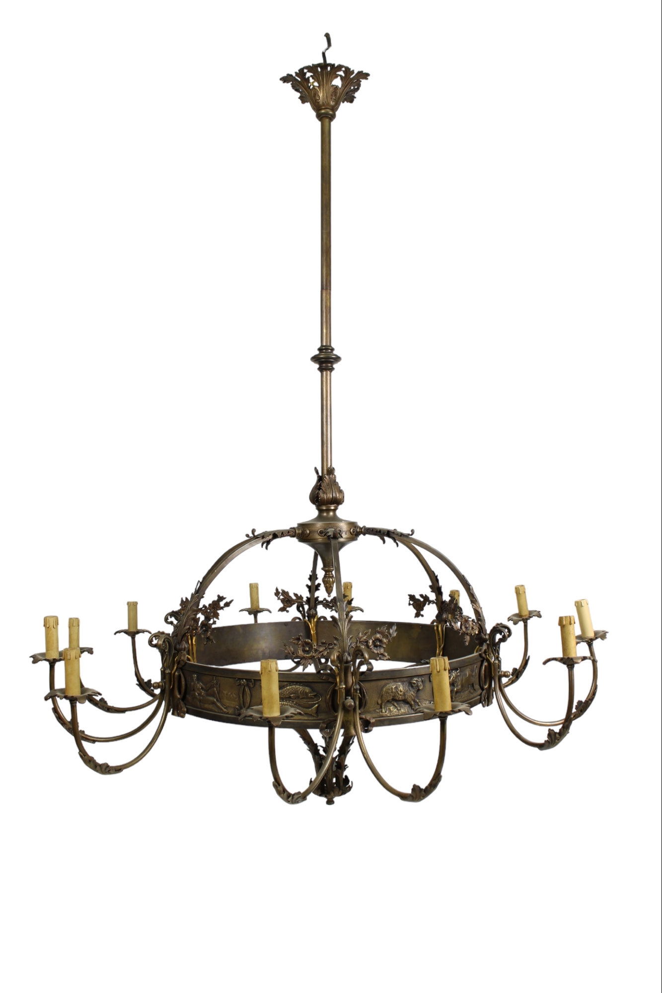 LAMPADARIO in bronzo dorato a 12 luci, fascia decorata da segni zodiacali a basso rilievo Italia XIX secolo h cm 162 x 125