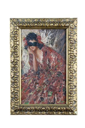 PICCOLO DIPINTO LIBERTY in cornice dorata raffigurante Giovane donna con mascherina firma illegibile Bari 1921 h cm 25 x 15 / cornice h cm 32 x 22