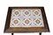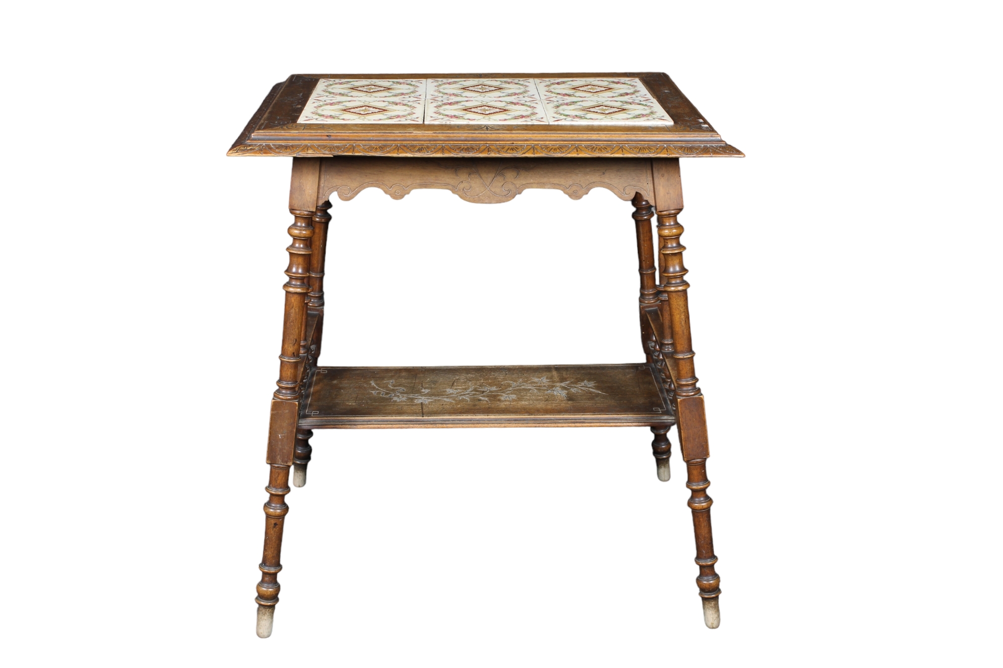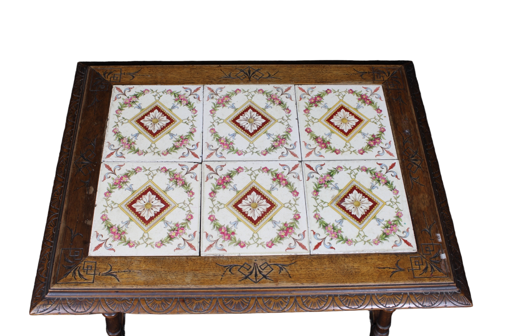 TAVOLINO in legno di rovere con piano a formelle in ceramica dipinta a motivi floreali Sicilia XIX secolo h cm 69 x 62 x 46