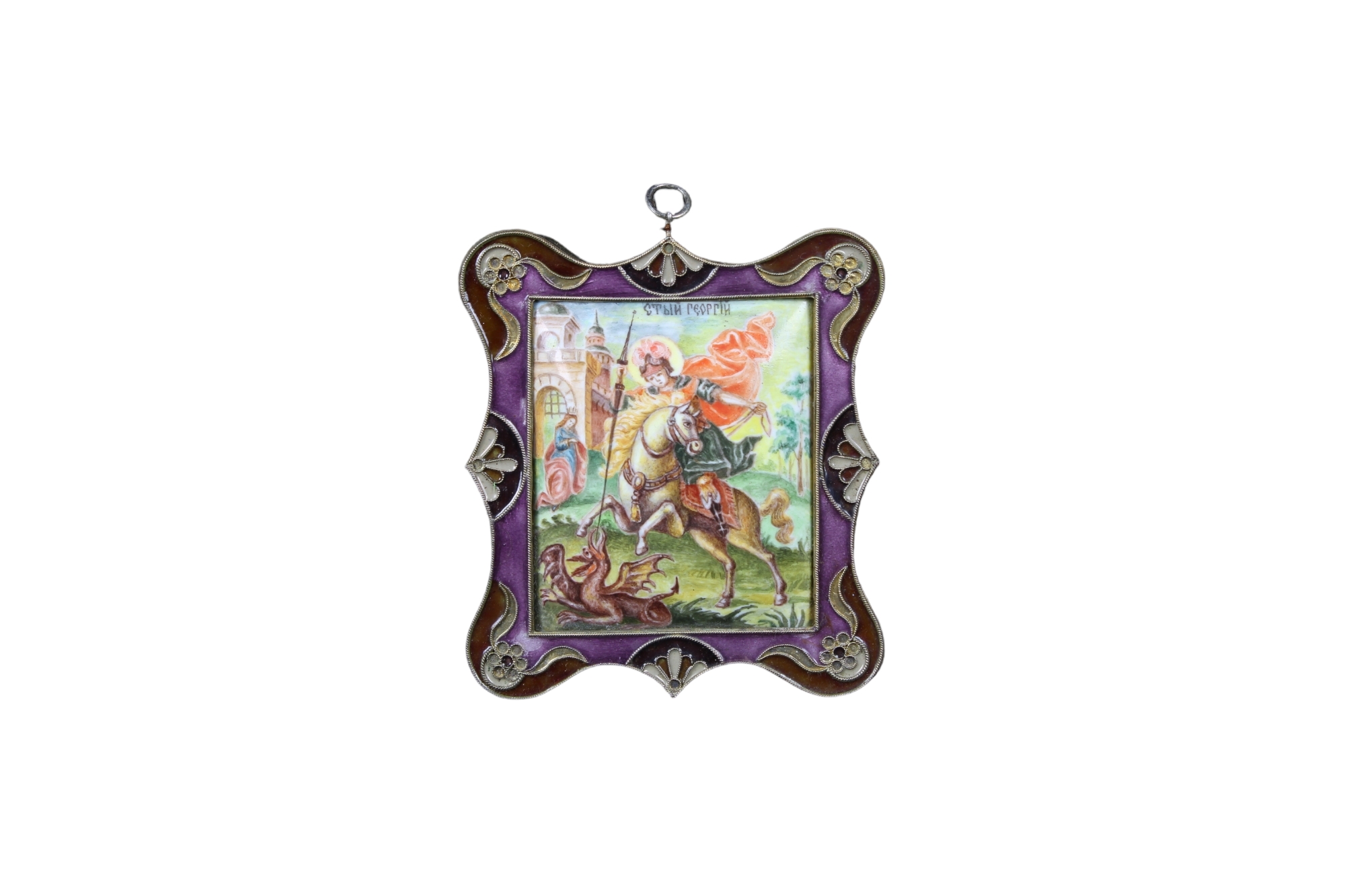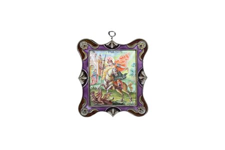 PLACCA in smalto raffigurante San Giorgio e il drago dentro cornice in metallo argentato e smalti manifattura baltica XX secolo h cm 23,5 x 19,5 / h cm 8,5 x 7,5