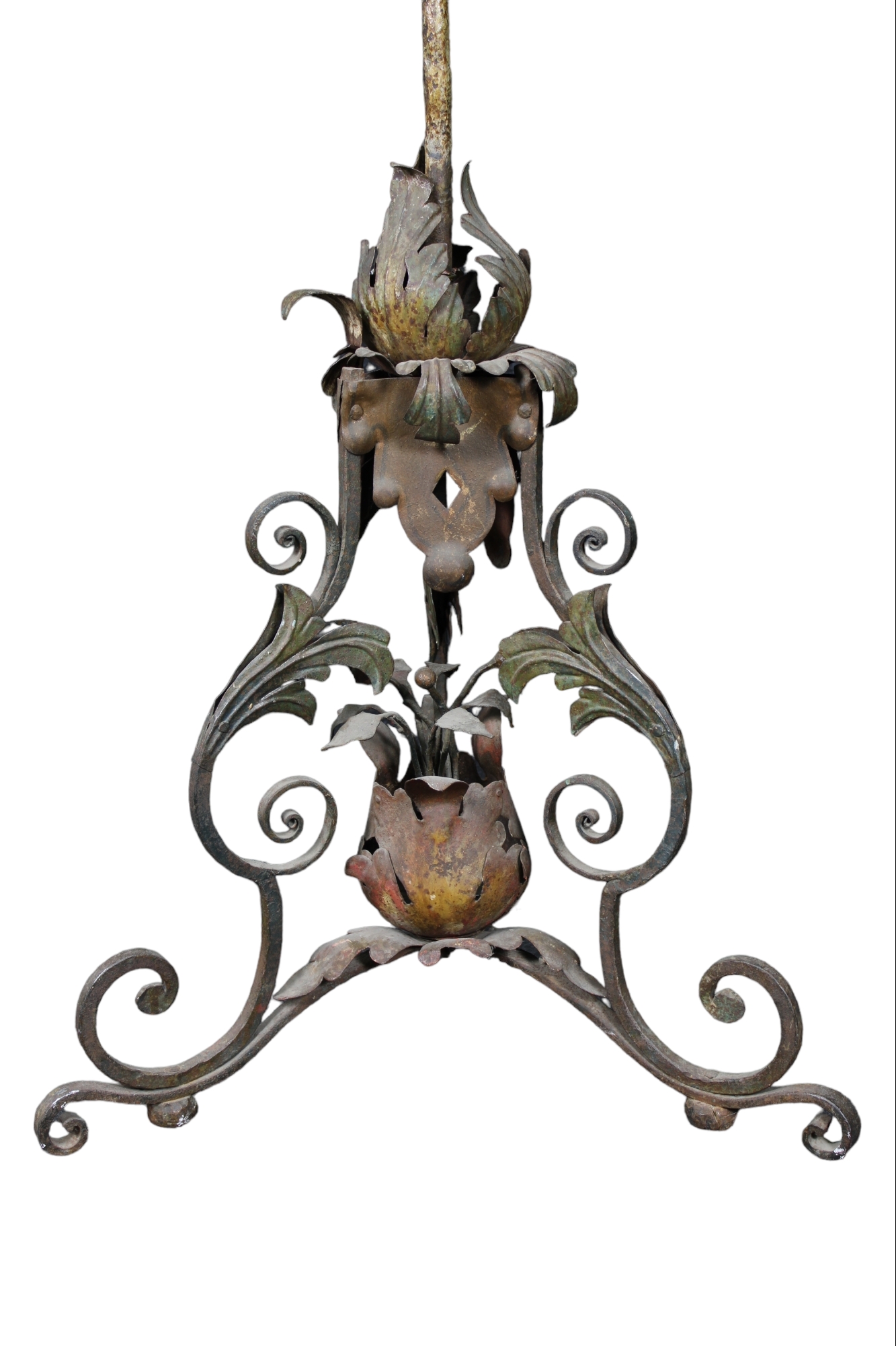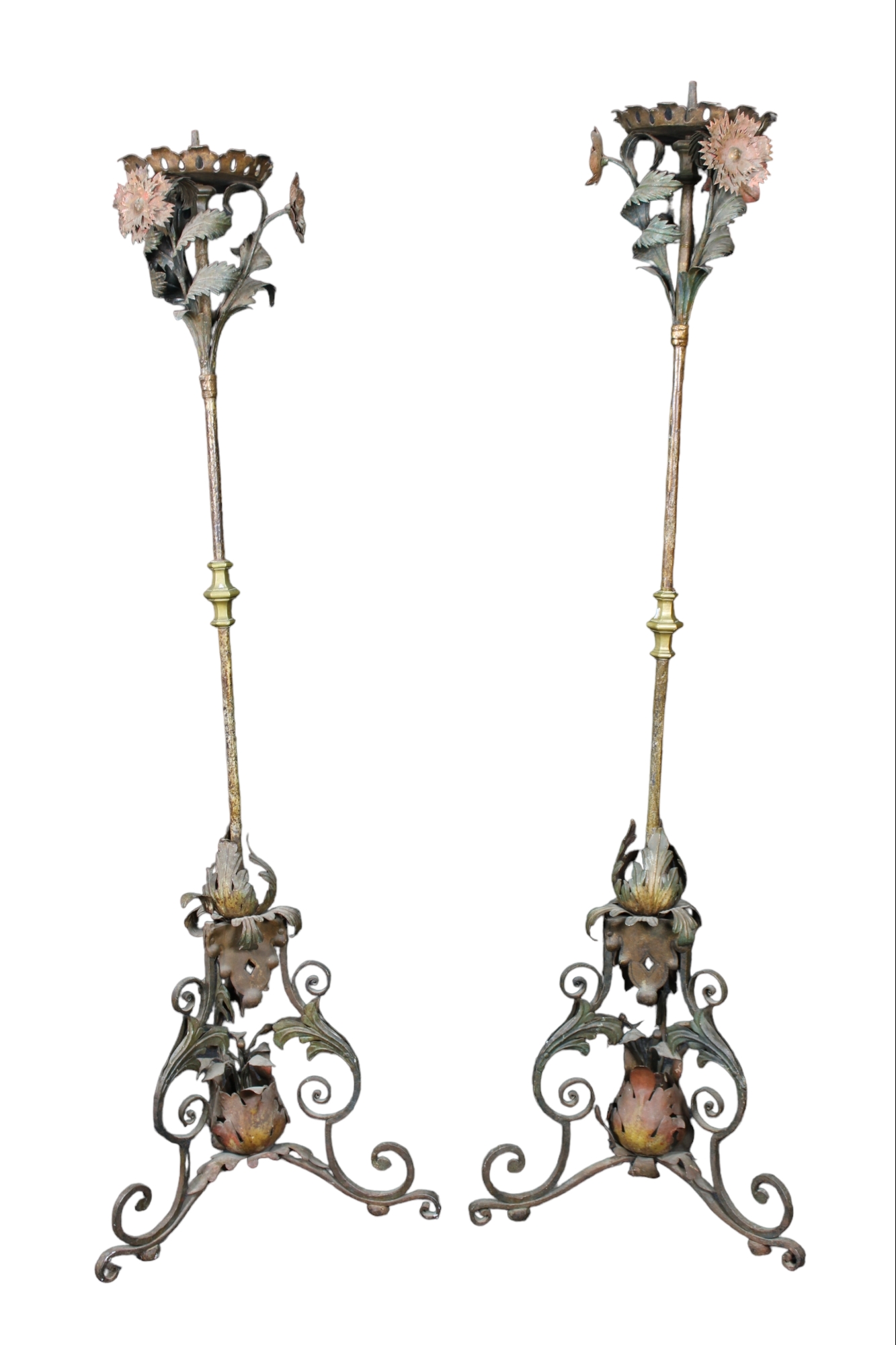 COPPIA DI IMPORTANTI TORCERI in ferro dipinto, arricchito da foglie e fiori in ferro policromo maestranze veneziane XVII-XVIII secolo h cm 190 x 58