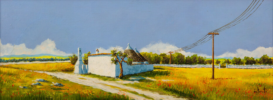 INTONTI PASQUALE'Paesaggio con trullitempera, acrilico su tavolaanno 2007cm 35x95firmata in basso a destraal retro: etichetta dell'Artista con descrizione