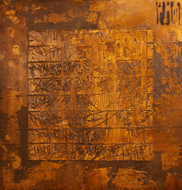 PHO (MARCO GRASSI)'Codice/42'tecnica mista su legnoanno 2004cm 110x110firmata in alto a destraal retro: titolo, firma e anno