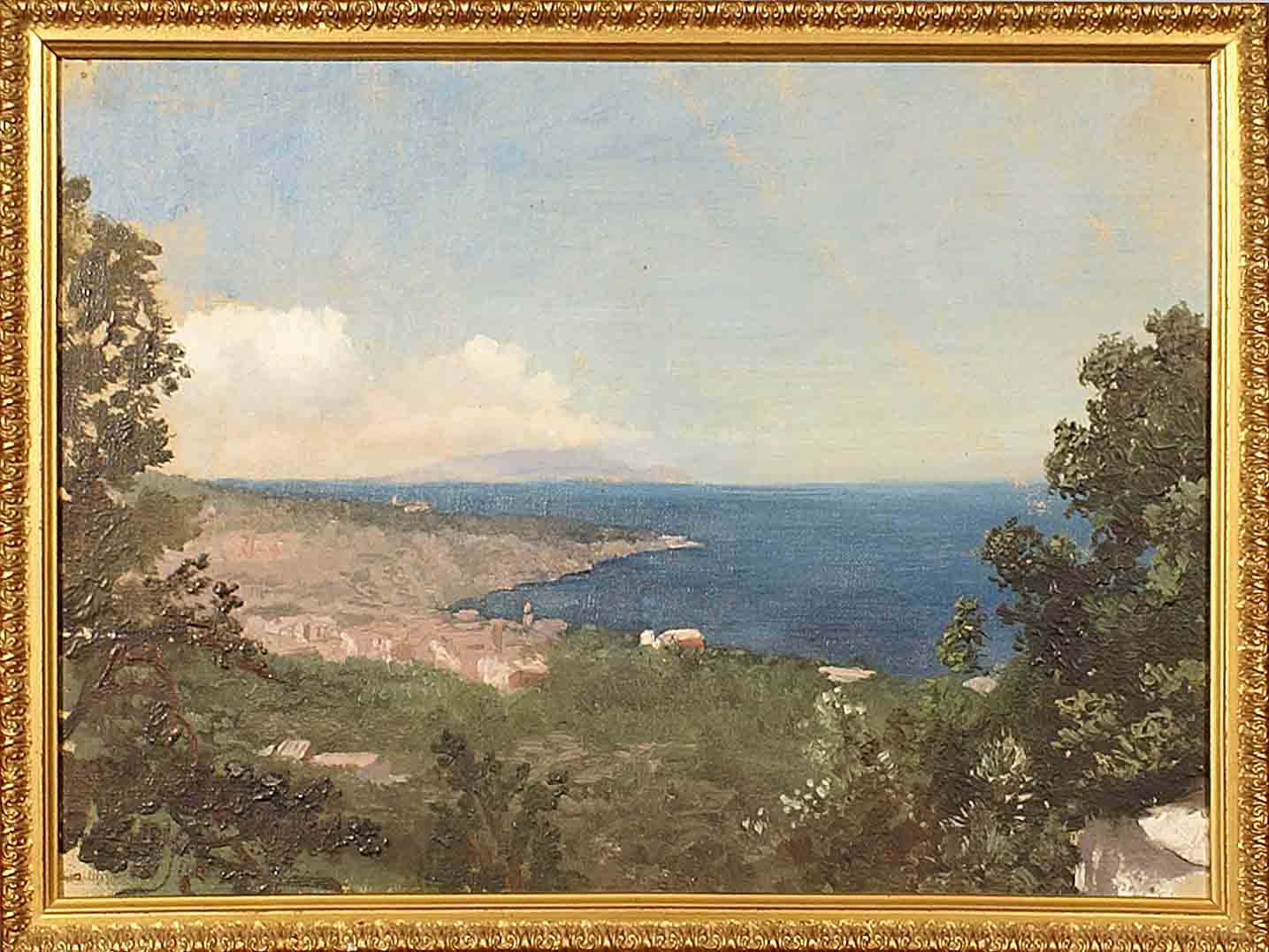 Firma indecifrabile, pittore degli inizi del XX secolo, "Veduta della costiera amalfitana", olio su cartoncino telato, cm. 22,5x31, firmato in basso a sinistra.